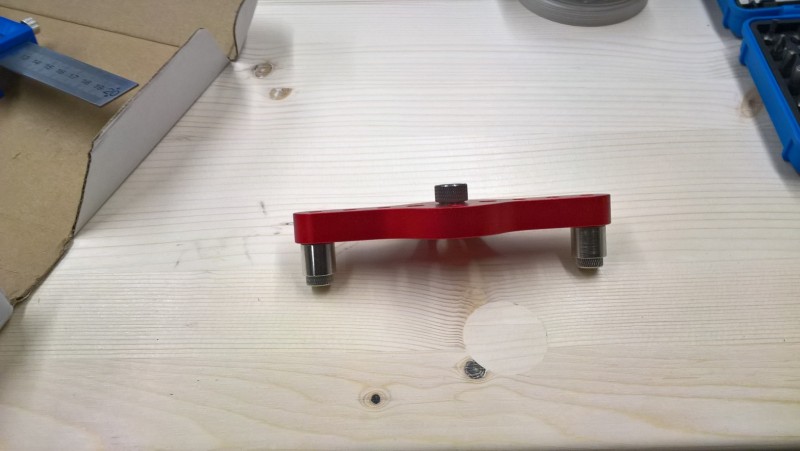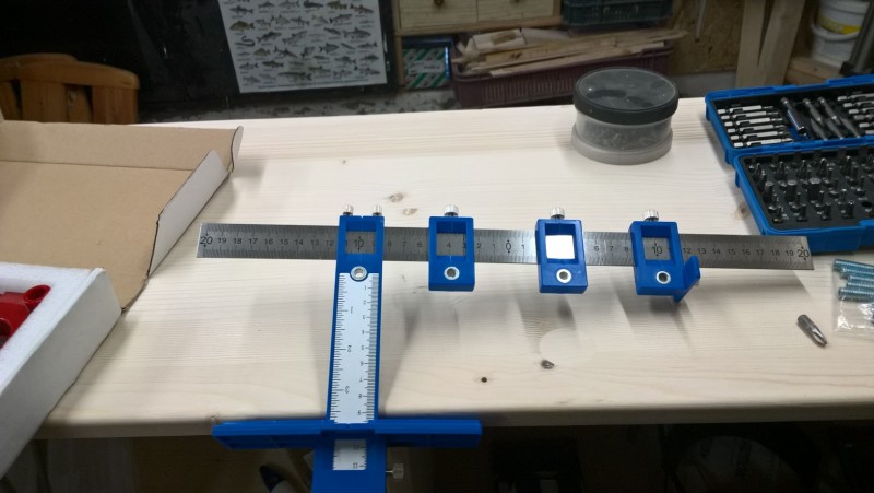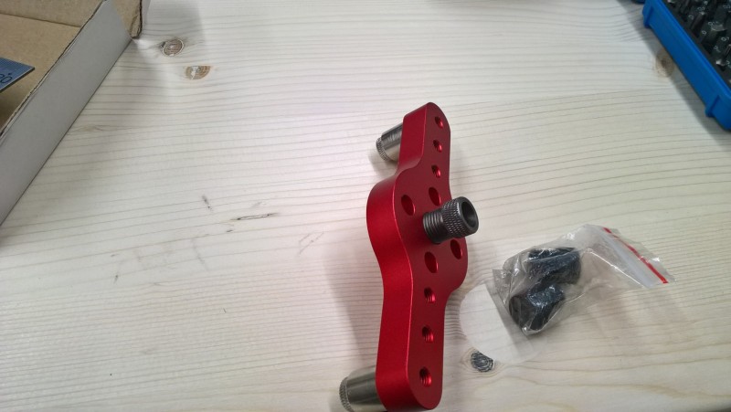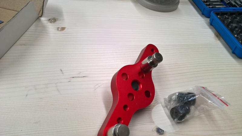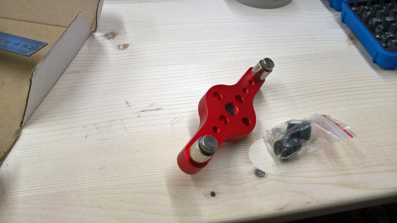 Dále tu mám vystřeďovací šablonu. Tedy takový přípravek, díky němuž navrtám vždy střed prkna apod. Také koupeno na Aliexpresu, ale je vyrobený z hliníku a díky tomu dost pevný a robustní. Ve středovém otvoru můžu měnit průchodky pro vrták ve velikostech 6, 8 a 10 mm, což je pro kolíkování dostačující. Vodící čepy po stranách mají ložiska, proto se po dřevě snadno pohybují.