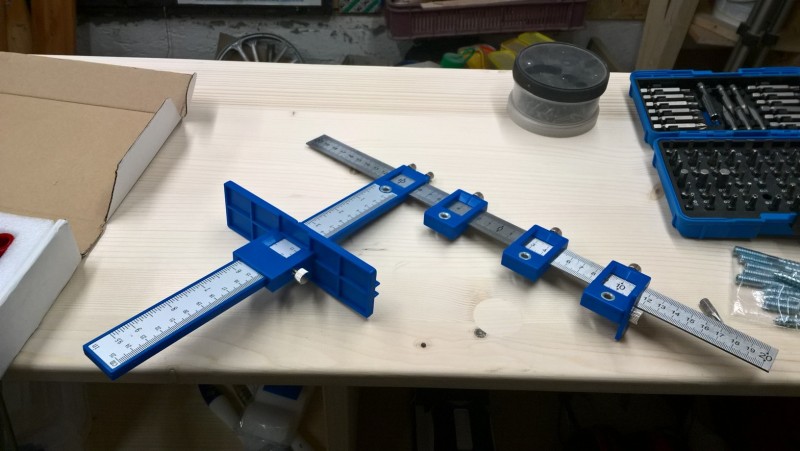 Jako další tu mám vrtací šablonu pro předvrtávání spojovacích kolíků. Díky ní není třeba vše složitě rozměřovat. Nastavíme rozteče a buď označíme místa pro vrtání otvorů nebo přímo vrtáme skrz otvory v šabloně.
