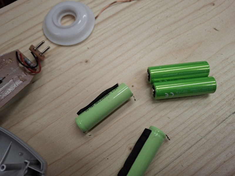 Uvnitř jsem pak nalezl 2 Ni-MH baterie velikosti AAA (jen bez výstupku na + kontaktu). Koupil jsem tedy klasické AAA Ni-MH baterie (měly stejnou kapacitu) a pospojoval je dohromady dle původního zapojení původních baterií.