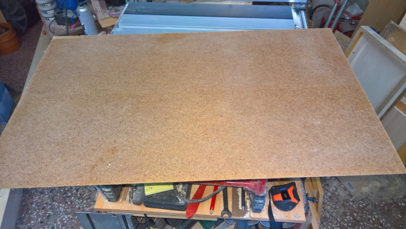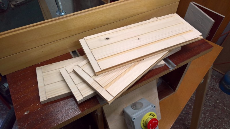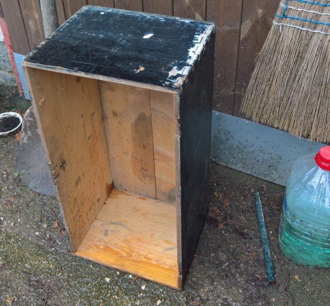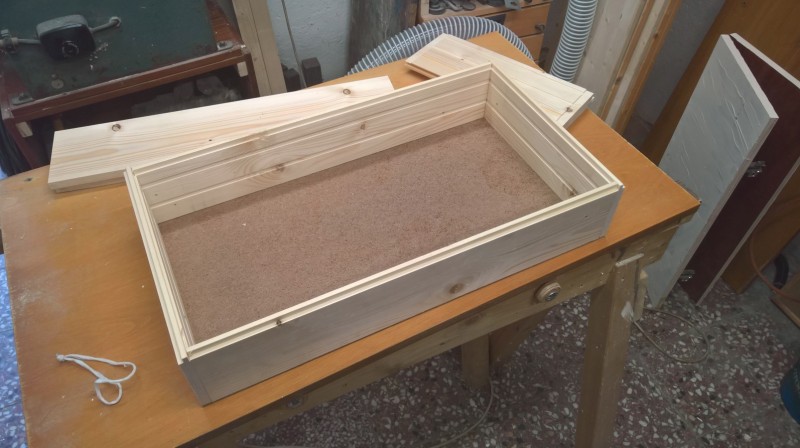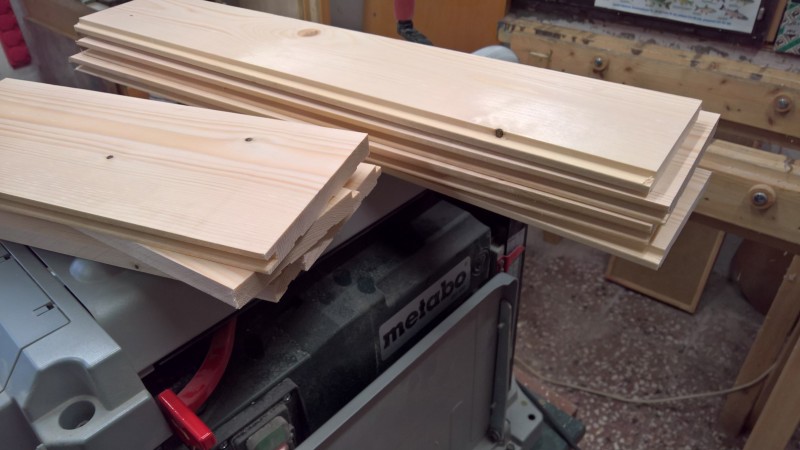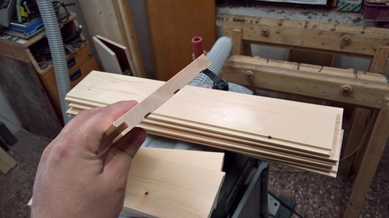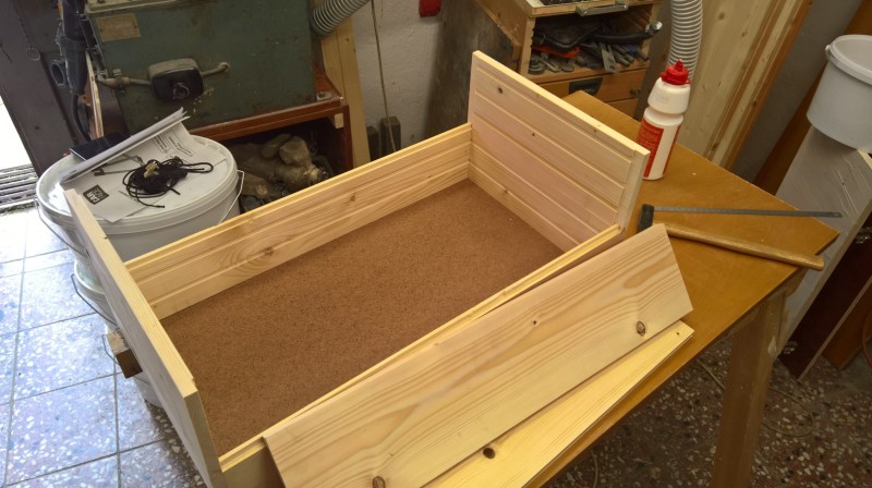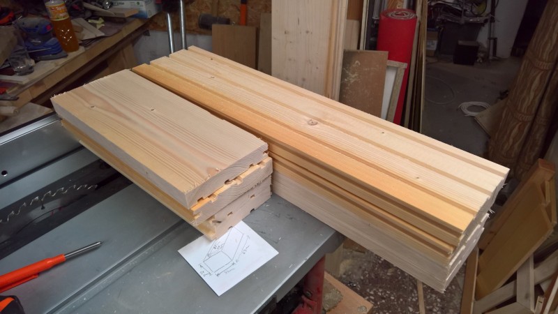 Konkrétně jsem použil zbytky dřevěné podlahy, kterou jsem loni pokládal do pokoje v přízemí a předloni do obýváku. Původní bedýnku jsem si změřil a podlahové palubky nařezal na potřebné délky. Poté jsem je zhobloval na tloušťku 14mm. U kratších prken jsem ještě udělal mírný falc (z vnitřní strany totiž mají drážky) a pak na desce sololitu bednu postavil.