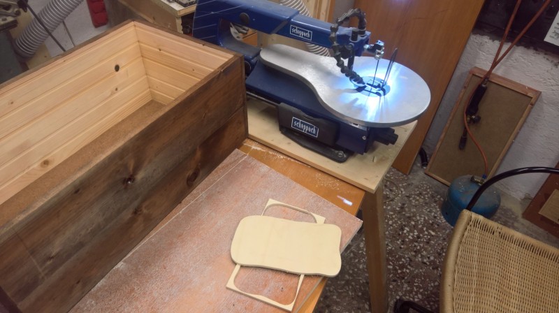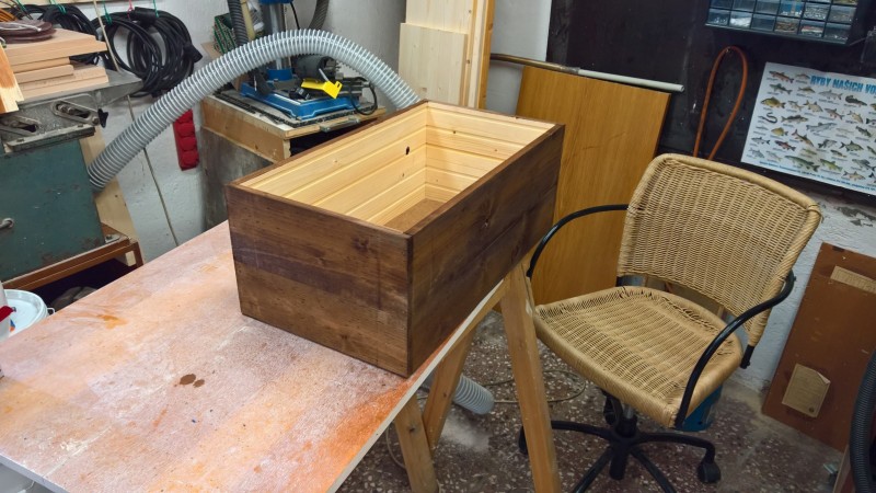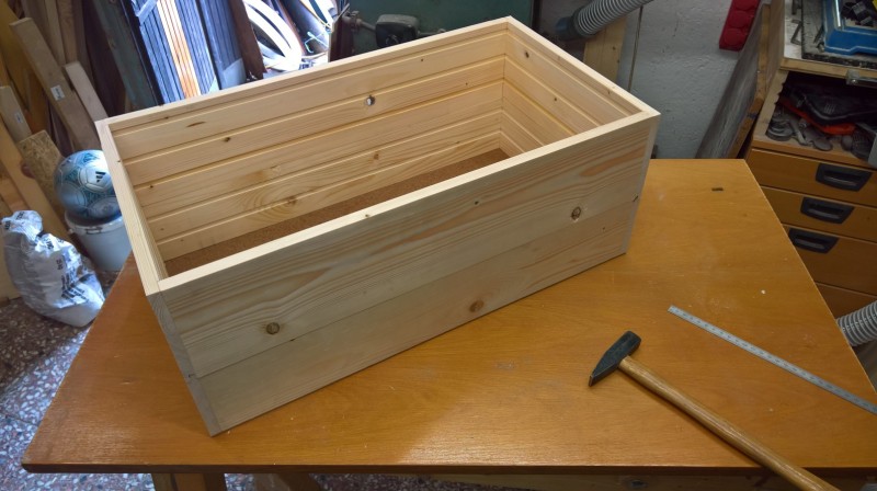 Konkrétně jsem použil zbytky dřevěné podlahy, kterou jsem loni pokládal do pokoje v přízemí a předloni do obýváku. Původní bedýnku jsem si změřil a podlahové palubky nařezal na potřebné délky. Poté jsem je zhobloval na tloušťku 14mm. U kratších prken jsem ještě udělal mírný falc (z vnitřní strany totiž mají drážky) a pak na desce sololitu bednu postavil.