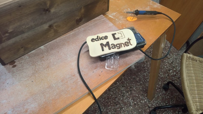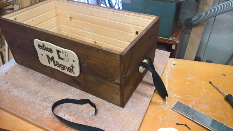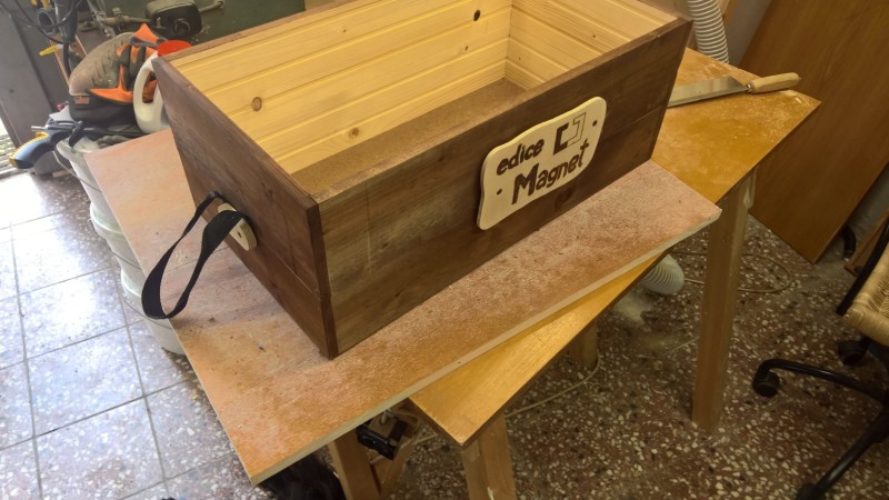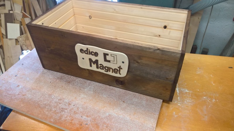 Hotovou bednu jsem natřel lihovým mořidlem v odstínu ořech. Z obdélníkové překližky jsem lupínkovou pilkou vyřízl obdélník s vlnitými stranami a zaoblenými rohy. Na ten jsem vypalovačkou vypálil nápis „edice Magnet“ a logo a připevnil to na bok bedny. Pak jsem ještě uřízl dva menší obdélníčky, těm zakulatil rohy, a pomocí nich k čelům bedny připevnil popruhy na přenášení. A bylo hotovo.