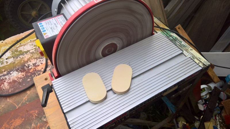 Pokud tvarujete (řezáním či broušením) dva a více stejných kousků dřeva a chcete aby byly naprosto stejné, slepte je oboustrannou lepicí páskou k sobě – jako jsem udělal já u upevňovačů popruhů na přenášení bedny – viz jeden z posledních obrázků v galerii.