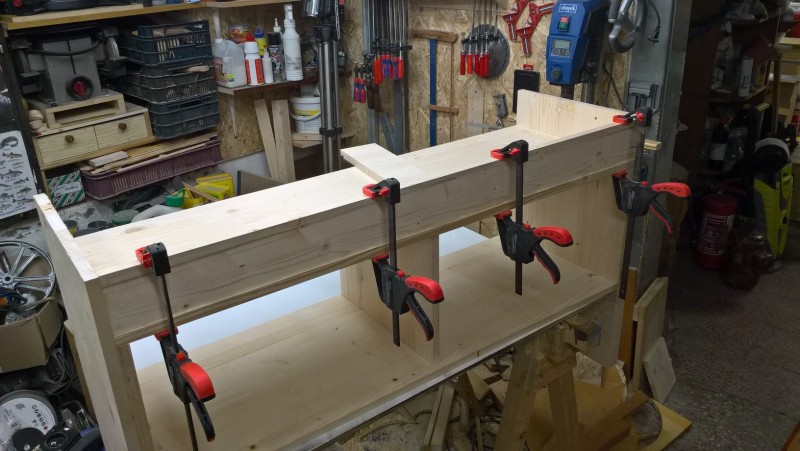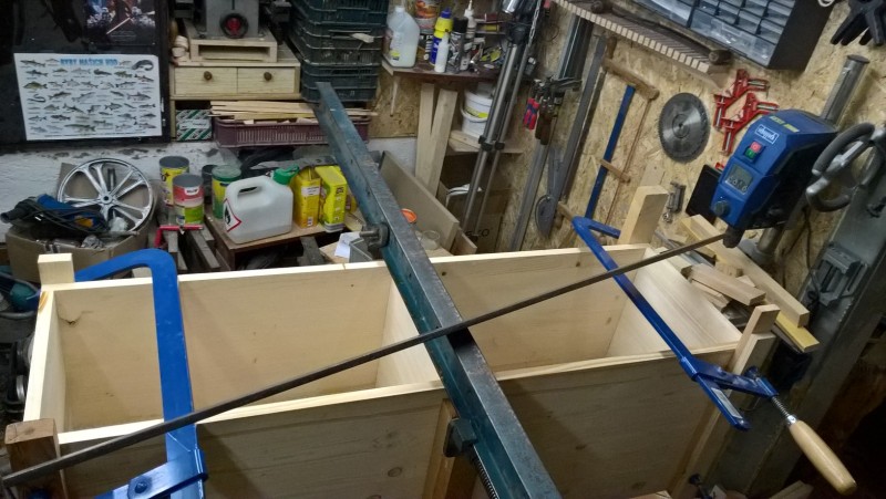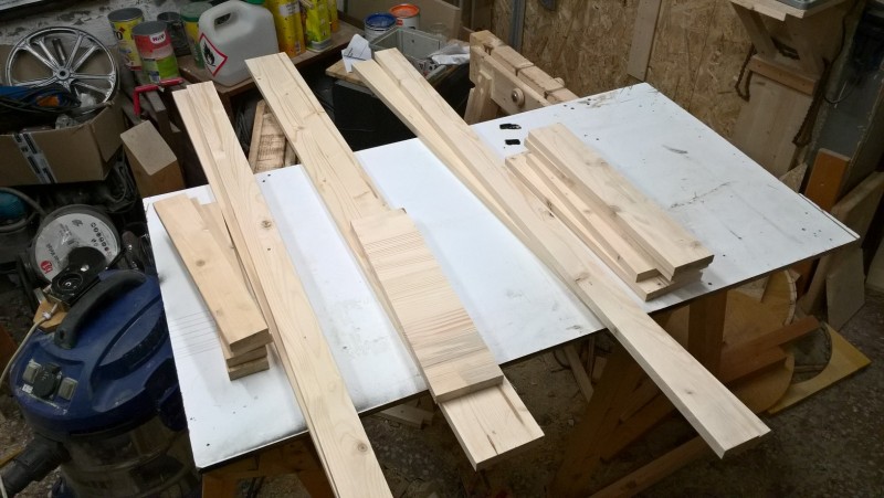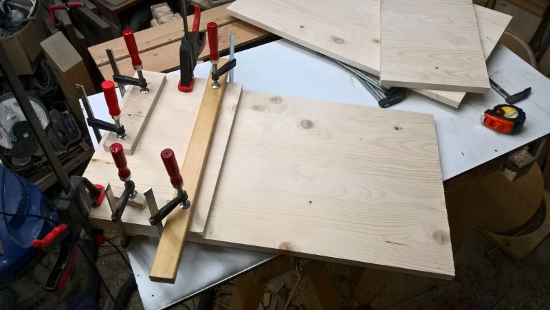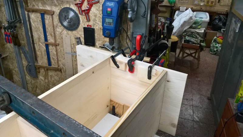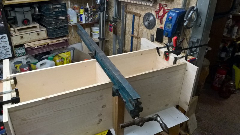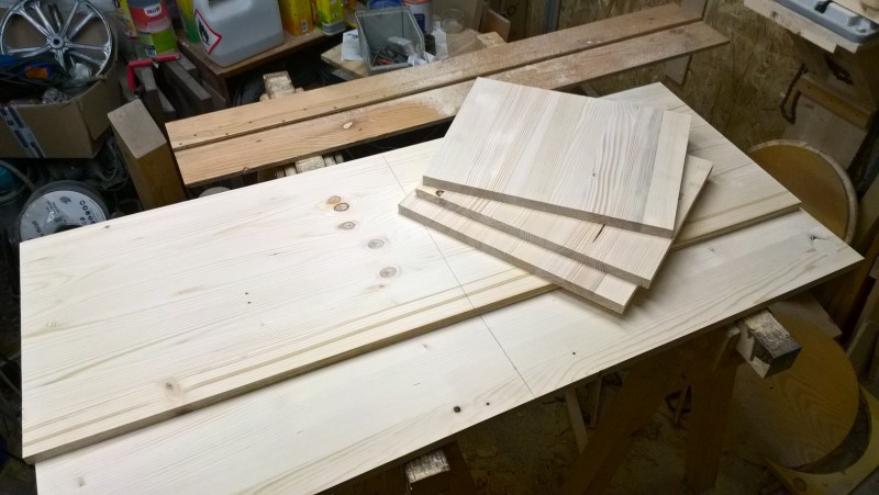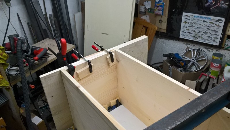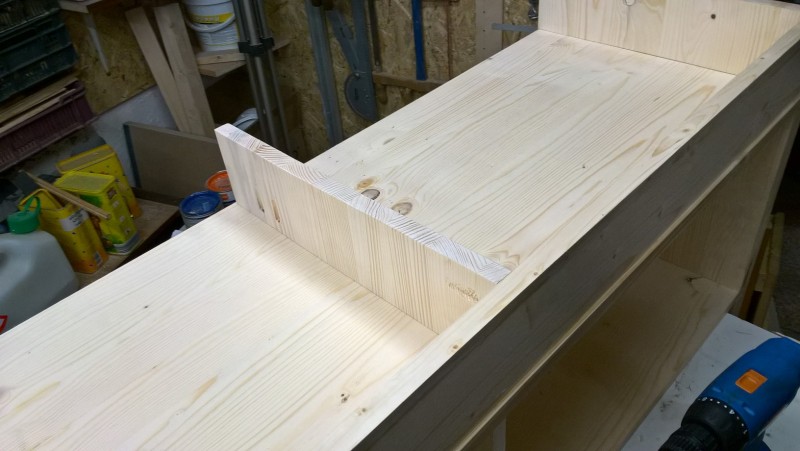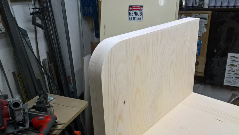 Standardní spárovka má tloušťku 18mm, boční strany jsem chtěl ale silnější, proto jsem slepil 2 k sobě. Tedy uřízl jsem celé dvě bočnice a pak ještě kus spárovky, který jsem k bočnicím přilepil (a je nad sedací plochou) – pochopitelné to je z vyobrazení v galerii. Pak jsem vyrobil hlavní tělo lavice a k němu potom bočnice přilepil, díky tomu jsou boční stěny silné 36 mm.