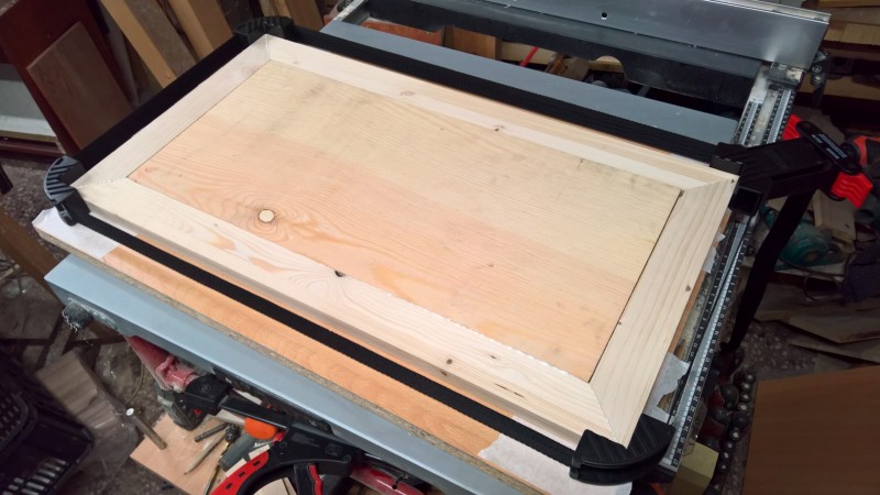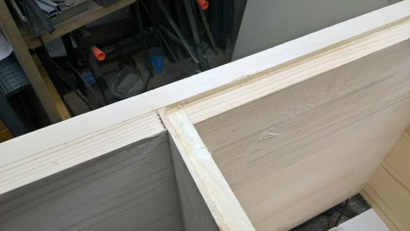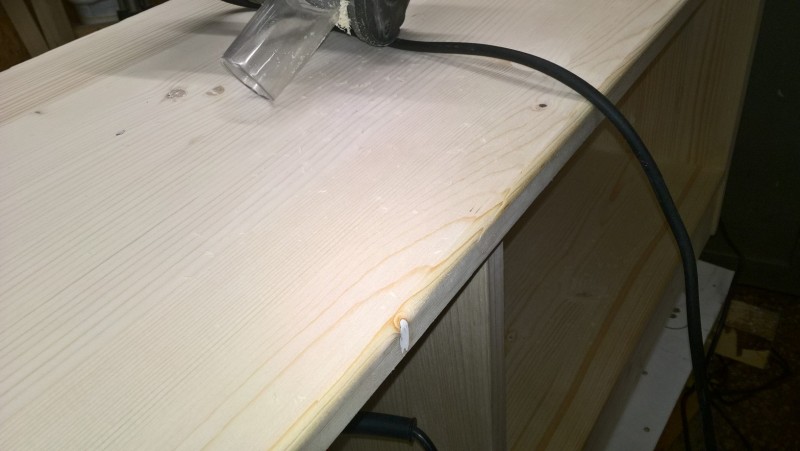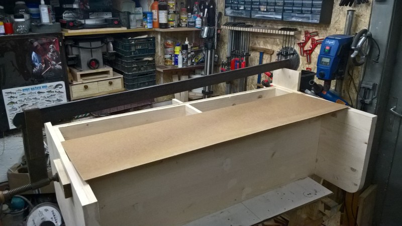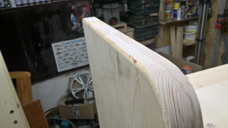 Standardní spárovka má tloušťku 18mm, boční strany jsem chtěl ale silnější, proto jsem slepil 2 k sobě. Tedy uřízl jsem celé dvě bočnice a pak ještě kus spárovky, který jsem k bočnicím přilepil (a je nad sedací plochou) – pochopitelné to je z vyobrazení v galerii. Pak jsem vyrobil hlavní tělo lavice a k němu potom bočnice přilepil, díky tomu jsou boční stěny silné 36 mm.