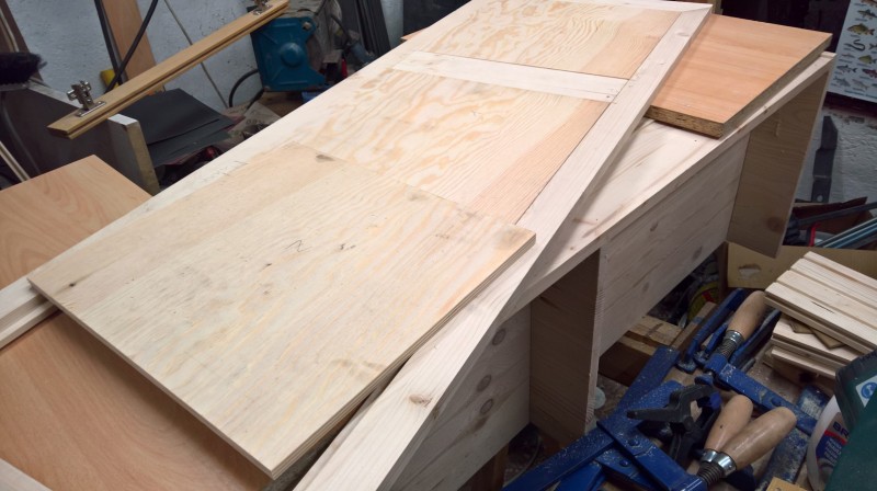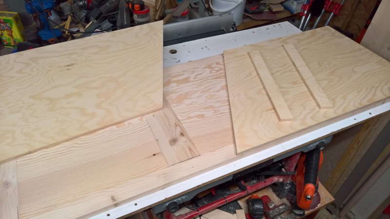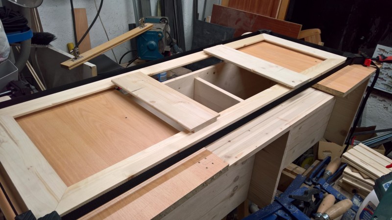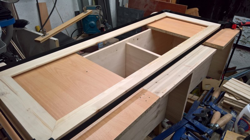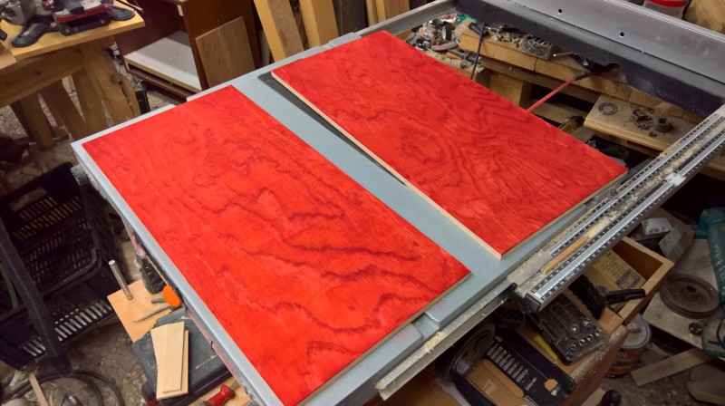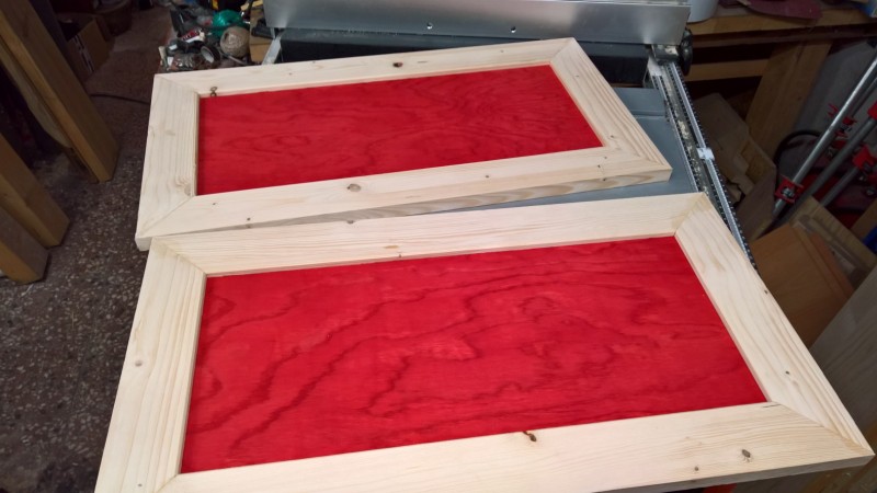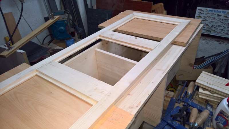 Dále jsem přilepil sokl a spodní výztuhu, aby se lavice neprohýbala. Pak jsem si z překližky (síla 10 mm) uřízl dva obdélníky a ze smrkových latí jsem jim vyrobil rámečky. To budou dvířka úložného prostoru. Překližky jsem namořil červeným mořidlem. Stejně jako u botníku a u věšáku na kabáty. A nakonec jsem ještě vyrobil opěradlo. Zde jsem opět uřízl 10 mm překližku – tentokrát 3 téměř čtverce (opět jsem je namořil na červeno). Vsadil jsem je do rámu ze smrkových latí a celé to podlepil deskou překližky, aby se to celé neprohýbalo a bylo to hodně pevné.
