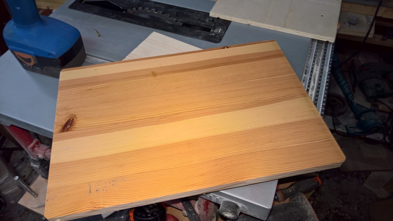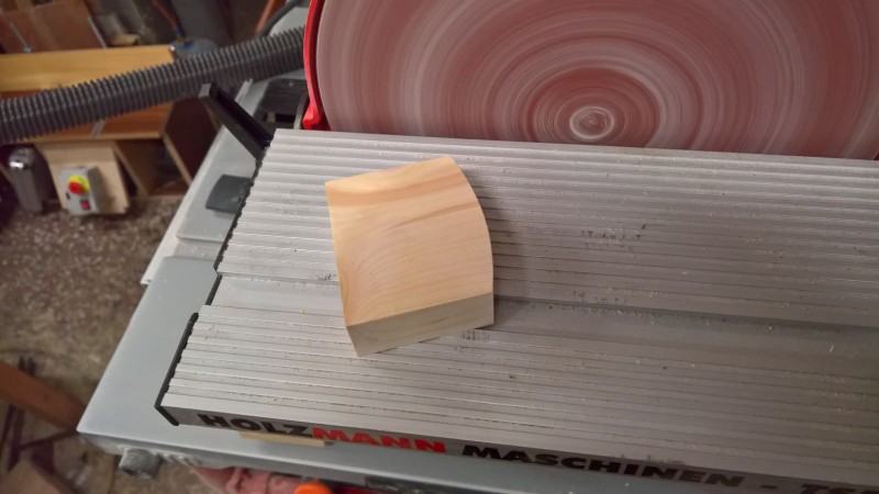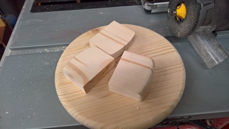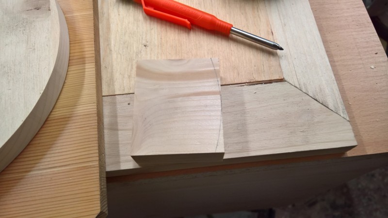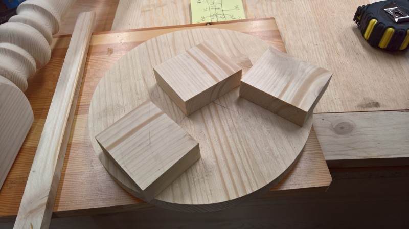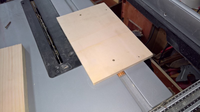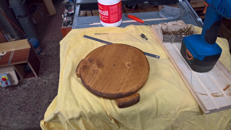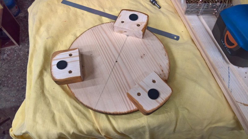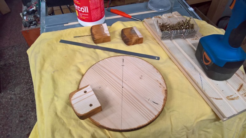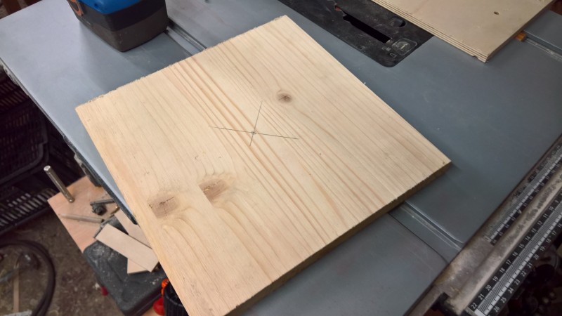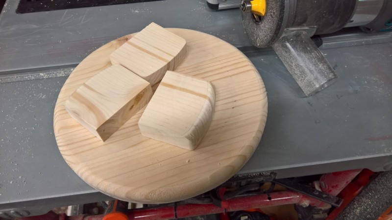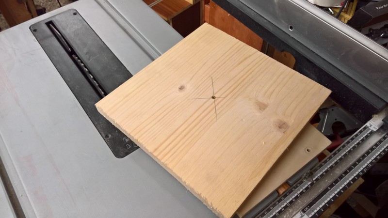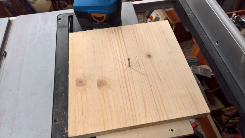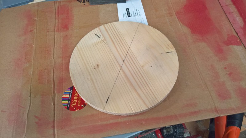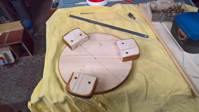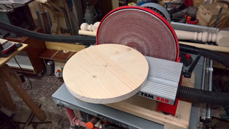 Pro výrobu kruhové desky jsem si k cirkulárce vyrobil přípravek, s jehož pomocí se povedlo přesné kolečko uříznout. Přípravek je také v galerii.