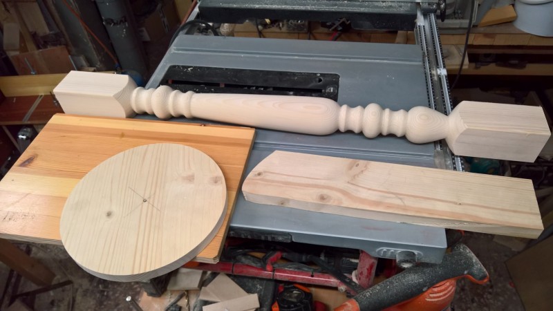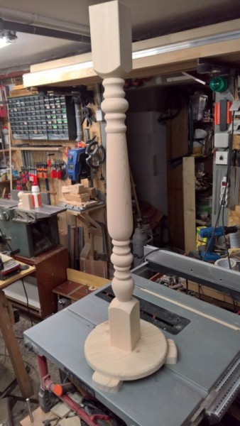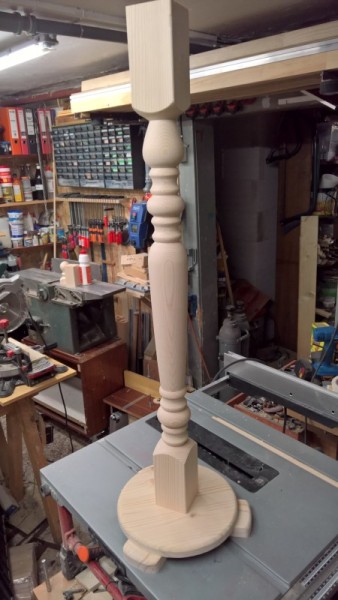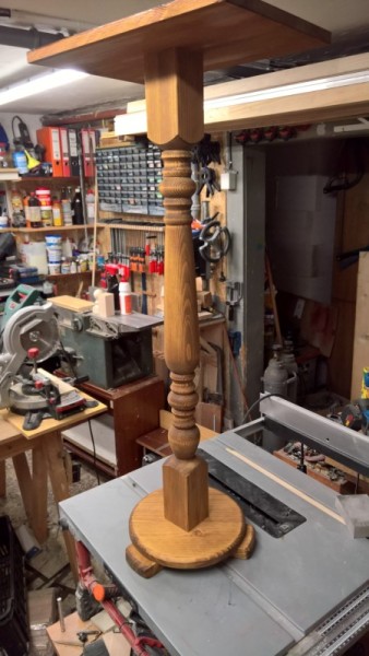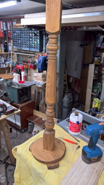 Pro stojan jsem použil nějakou spárovku, kterou jsem měl v dílně a nově jsem koupil v Baumaxu soustružený sloupek ke schodišťovému zábradlí, který se k tomuto účelu velice hodil. Jen jsem odřízl horní ozdobnou kouličku, a sloupek byl rázem použitelný jako noha stojanu.