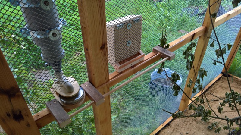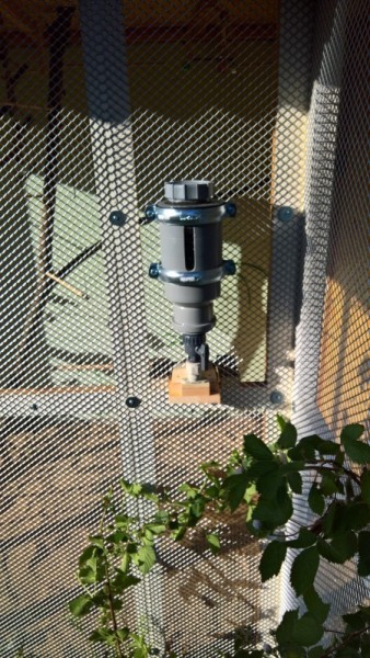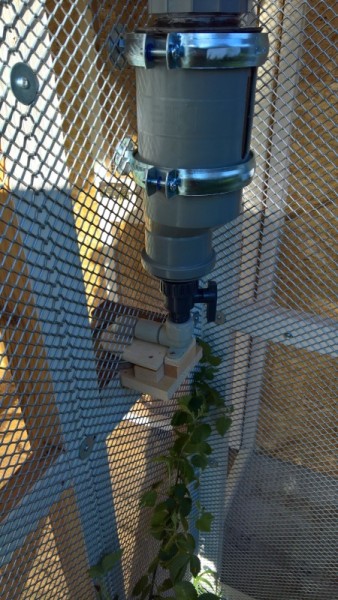 Původní verzi napaječky jsem vyrobil z HT tvarovek a redukcí (první 4 obrázky v galerii). Bohužel se ukázal problém s těsností plnicího otvoru, kdy do napaječky pronikal vzduch a tudíž voda přetékala. Problém s těsněním se mi nepodařilo vyřešit a proto jsem přistoupil k novému řešení, a sice použít starou napaječku pro králíky. Starou hliníkovou napaječku, kterých jsem jako kluk nakoupil několik pro svůj chov králíků, jsem teď po letech mohl využít k novému účelu. Stačilo jen vyrobit upevnění pro napaječku a také pro láhev na vodu a bylo hotovo. Jednoduché a elegantní řešení.
