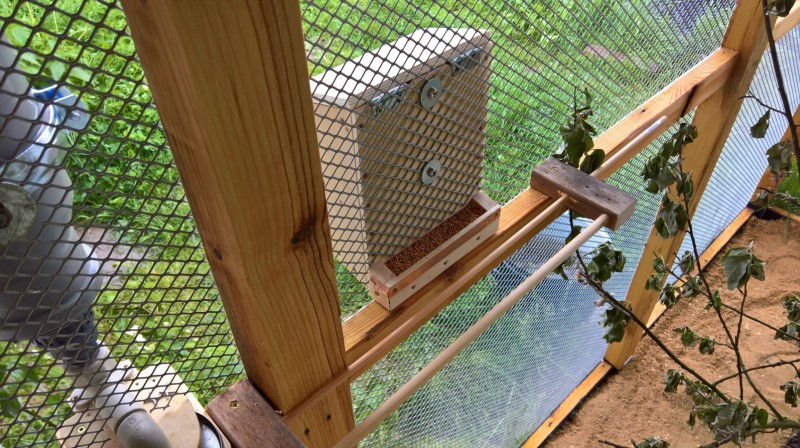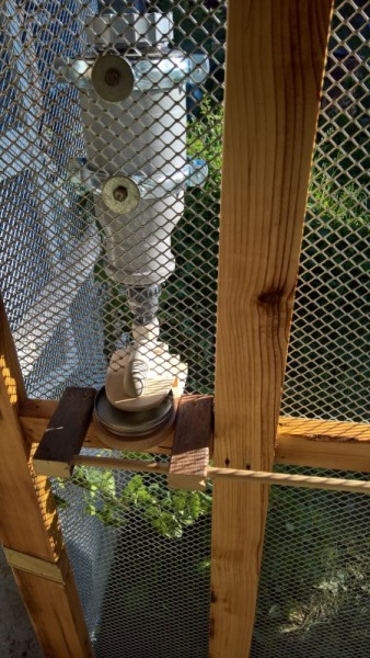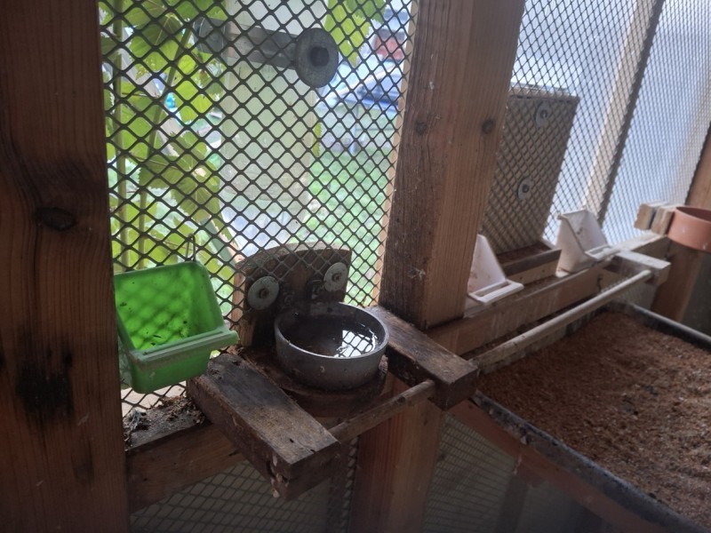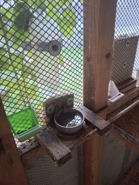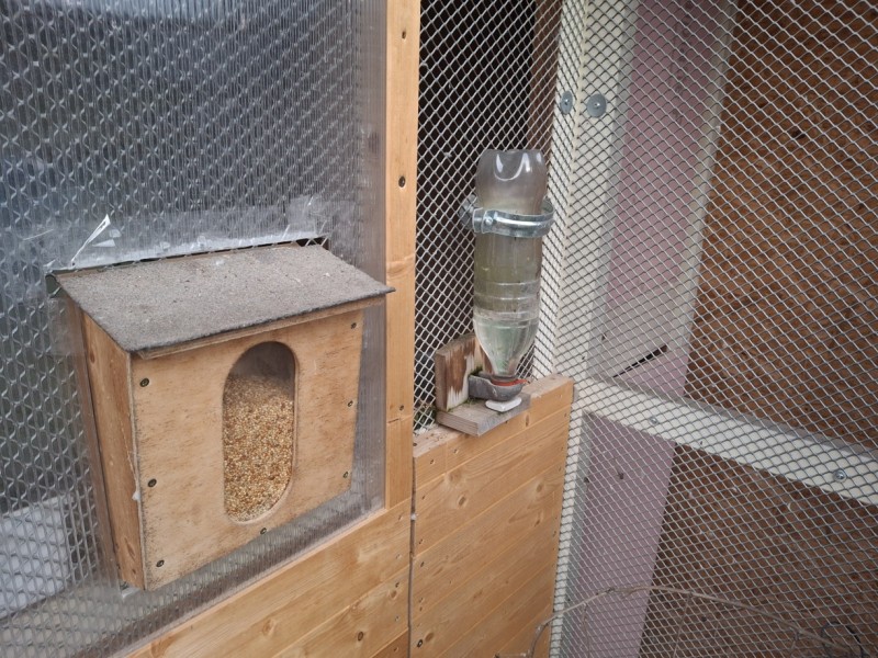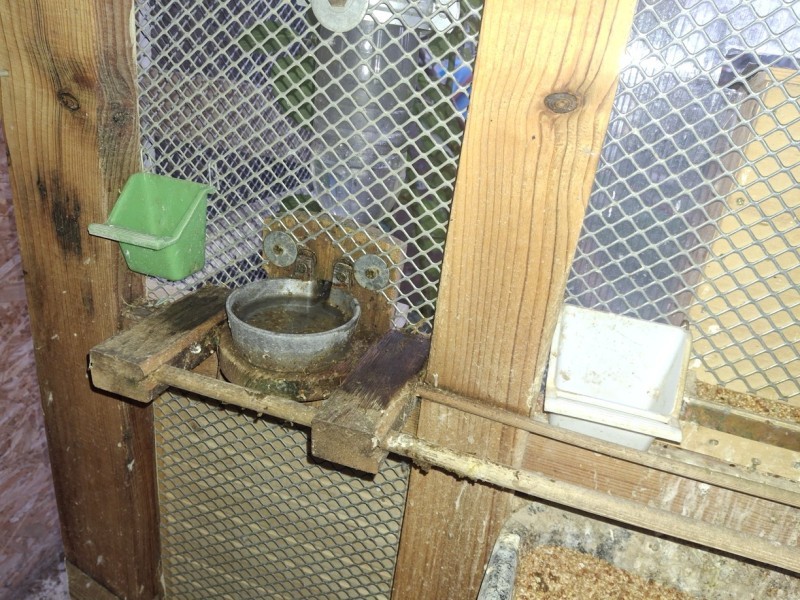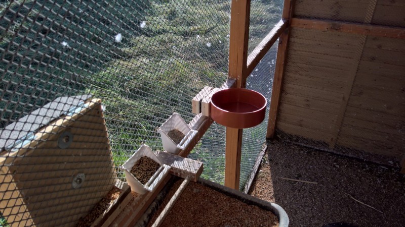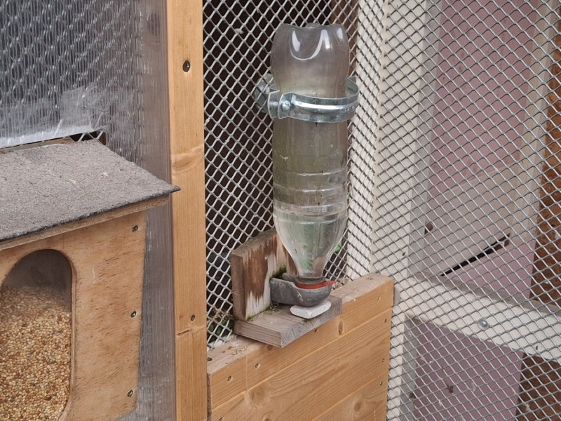 Potíž nastale jen s napaječkou. Tu původní jsem vyrobil z HT trubek, ale problém nastal s její těsností. Resp. s těsností doplňovacího otvoru, kde stále procházel vzduch a miska s vodou přetékala. Proto jsem ji pak nahradil starou hliníkovou napaječkou, kterých jsem jako kluk nakoupil několik pro svůj chov králíků. Teď po letech se jedna hodila.