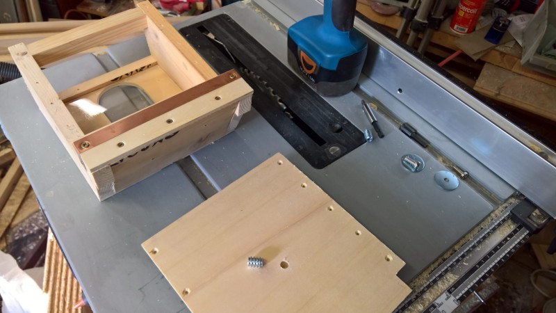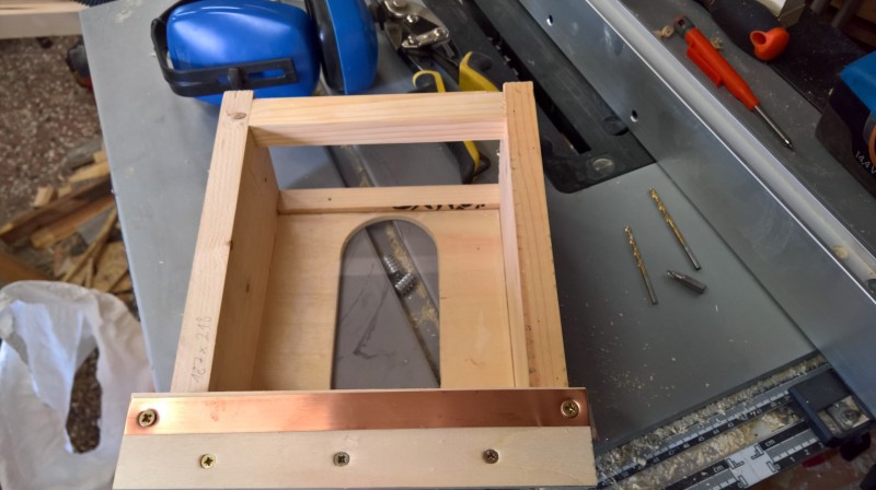 V galerii je hezky vidět, jak jsem postupoval při výrobě. Z venkovní strany je průhled do krmítka, opatřený plexisklem, aby bylo vidět kolik krmiva ještě zbývá (a zda tam není nezvaný hlodavec). Část, kam se sesypává krmivo a odkud andulky zobou, jsem také oplechoval měděnou páskou, aby andulky nerozebraly křehkou překližku, kterou jsem použil na stěnu krmítka.