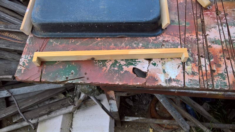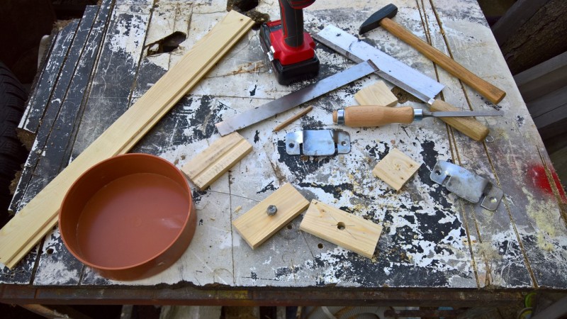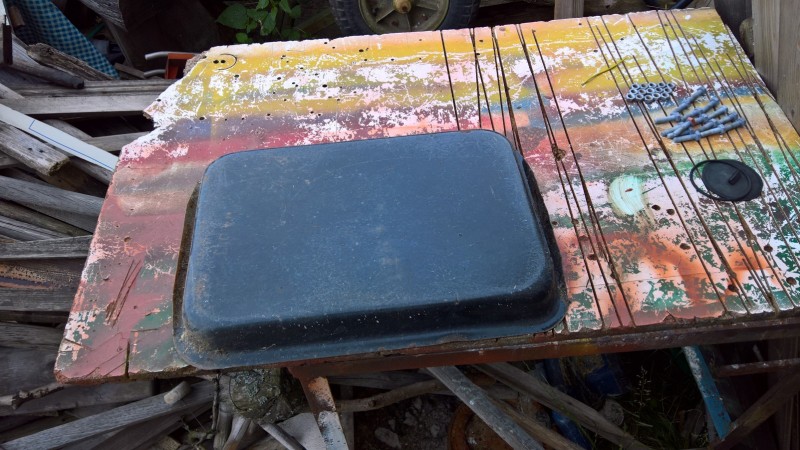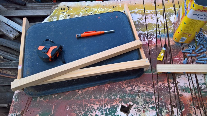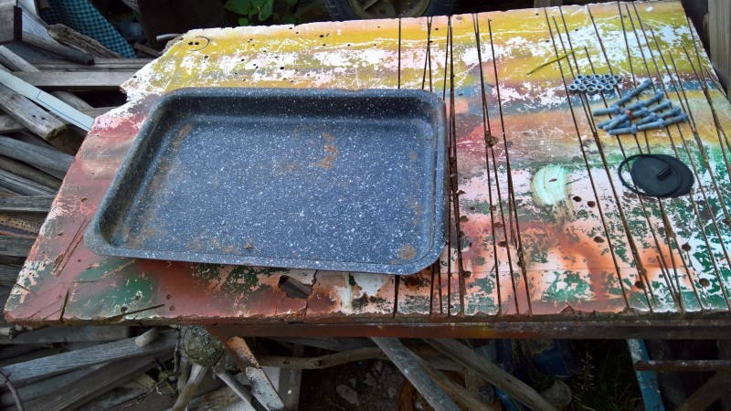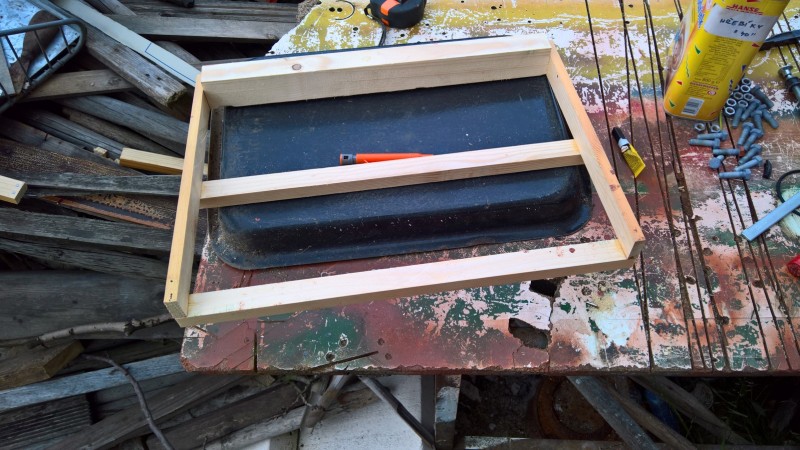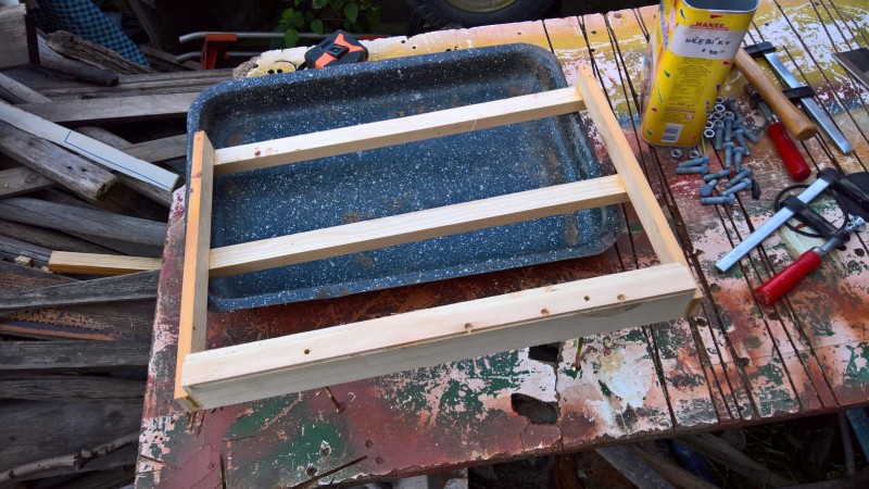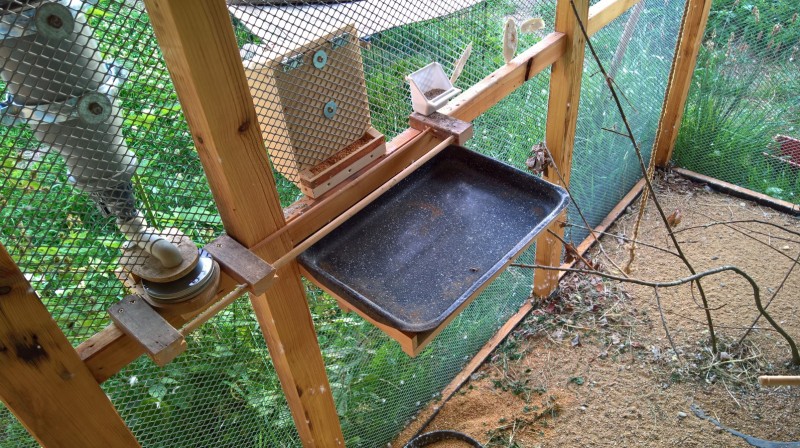 Krmítko funguje výborně, ale projevila se vlastnost andulek, a sice jejich čuňačení. Dokáží část zrní vyhrabat z krmítka ven a dost nasviní. Tak jsem ze starého pekáče vyrobil lapač zrní pod krmítko. Opět jsem použil starý materiál a sice pekáč a dřevěné laťky. Více v galerii.