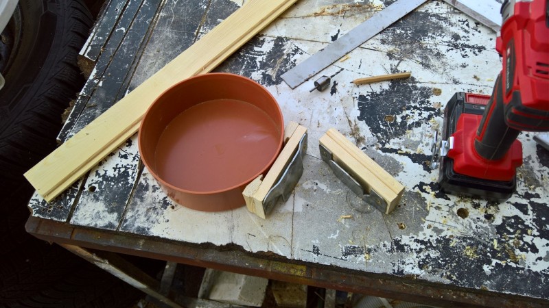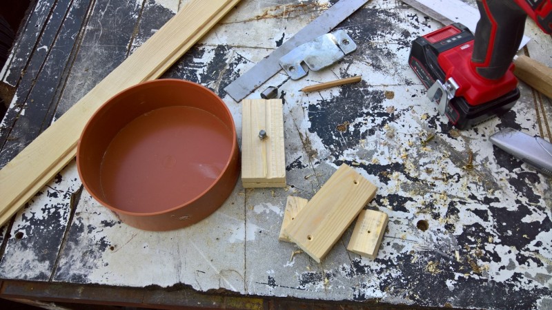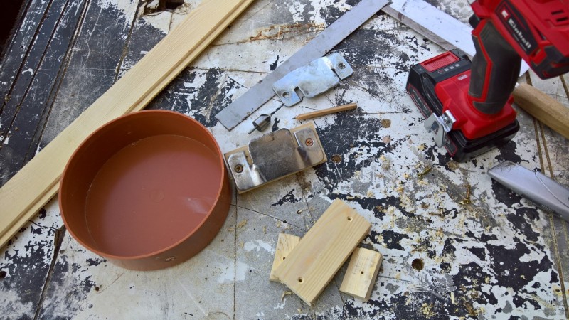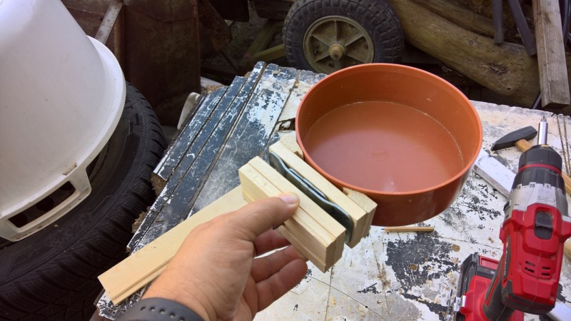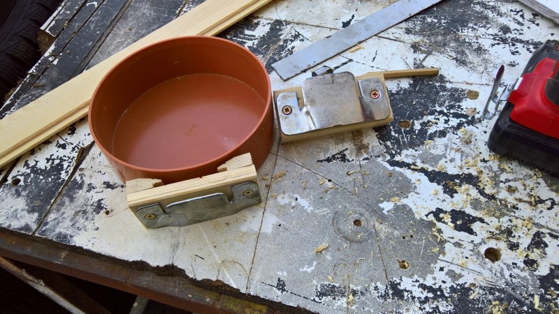 A jako zatím poslední věc jsem andulám vyrobil misku na zeleninu a další pamlsky, kterými jim občas přilepšuju. Na výrobu jsem použil opět odpadový materiál a záslepku odpadové KG trubky (to jsou ty oranžové) o průměru 200 mm. Pro snadnou manipulaci jsem na misku a díl na voliéře, připevnil kovové háky ze starého gauče (sloužily k připevnění bočnic). Miska se snadno vyhákne, abych ji mohl vyčistit, a zase zahákne zpět.
