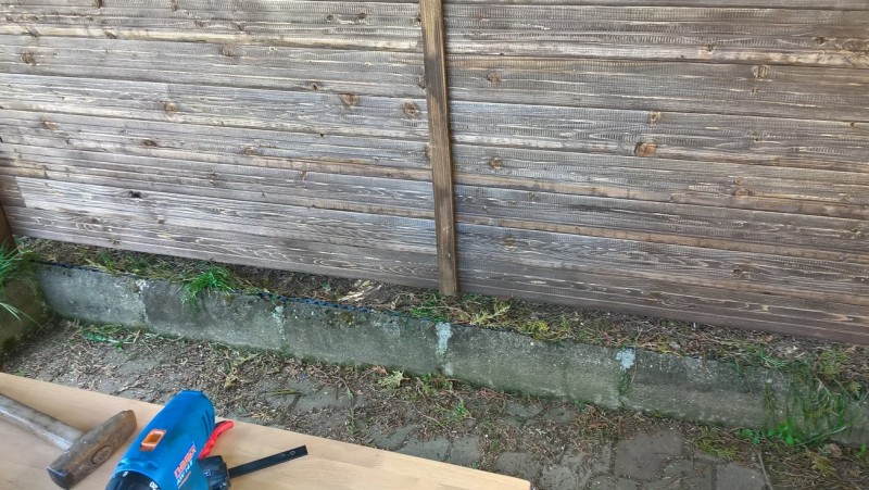 Nejprve bylo nutné připravit terén. Jelikož máme pozemek v kopci, vybrali jsme jako nejvhodnější umístění pro přístřešek místo na horní straně zahrady. Je to sice u plotu do ulice, ale to celkem nevadí. Je to blízko obýváku, do kterého se snadno dostaneme po kovovém schodišťi, které jsem před časem vyrobil.