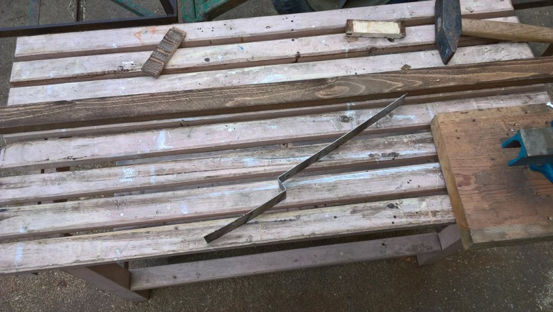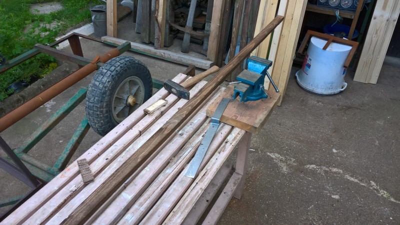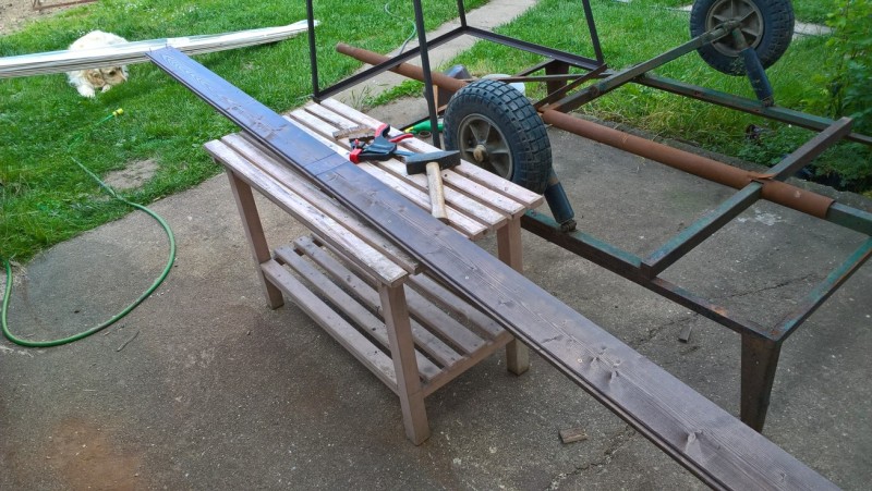 V patkách jsem vztyčil sloupy z KV hranolů 100 x 100 mm a výšce 1,8m. Na ně jsem připevnil obdélníkový rám ze stejných KV hranolů, jehož boční strany přesahují vepředu o 50 cm (aby se dosáhlo přesahu střechy). Krov jsem vyrobil z odbadových krokví (ty jsem vyšmelil od souseda, který je získal od někoho kdo přestavoval jakýsi přístřešek na velké stroje). Krokve byly jako nové, jen už jednou použité, takže pro mé účely naprosto ideální. Jsou o rozměrech 60 x 120 x 5000 mm. Krokve jsem zakrátil na délku 2,2 m (takže mi stačily celkem 4). Obrousil jsem je a připevnil k rámu přístřešku.