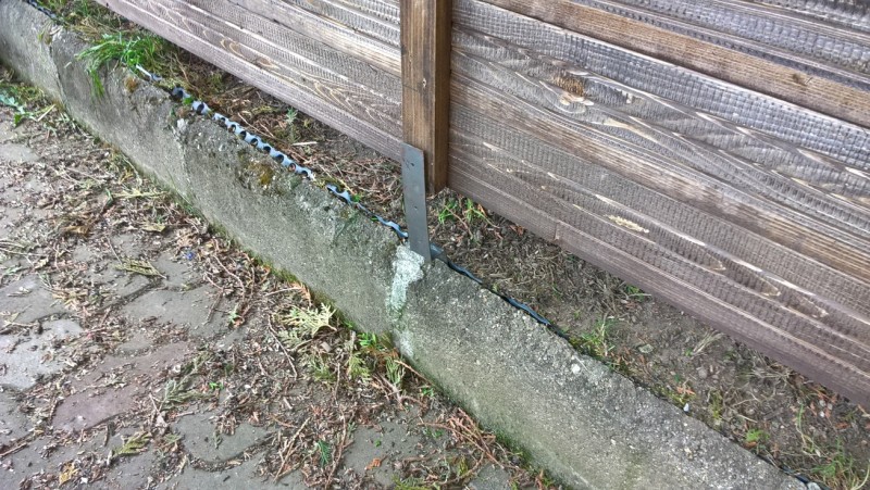 Vzhledem k terénu a dostupnému místu jsem rozměřil plochu přístřešku na šířku 3 m (podél plotu) a hloubku 2,5 m (kolmo k plotu). Hloubka nešla větší, protože bych se u plotu musel zavrtat už více než 50 cm pod úrověň terénu. Takto stačilo cca 30 cm do hloubky. Takto připravený obdélník jsem obehnal vysokými obrubníky, které jsem zakotvil pomocí betonu. Tyto obrubníky navíc tvoří zadní a boční stěny, které jsou cca 20 cm nad zámkovou dlažbou.