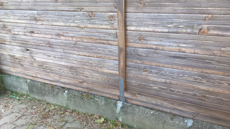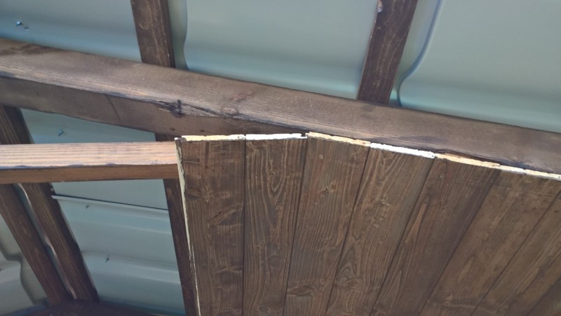 Nakonec jsem pobil palubkami zadní stěnu přístřešku (tu k ulici), od spodu až nahoru a také pravou stranu co poloviny výšky (ta přináleží k okrasné zahrádce před domem). A také jsem palubkami pobil krokve ze spodní strany a vytvořil tak strop celého přístřešku. Palubky jsem také natřel hnědým luxolem.