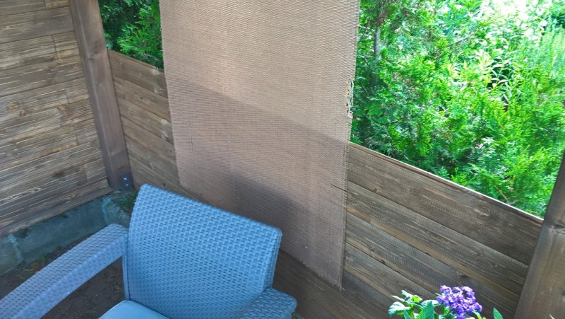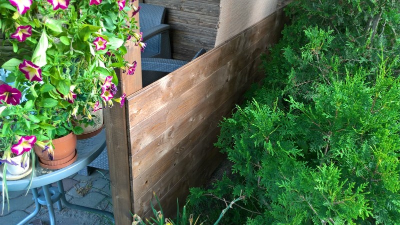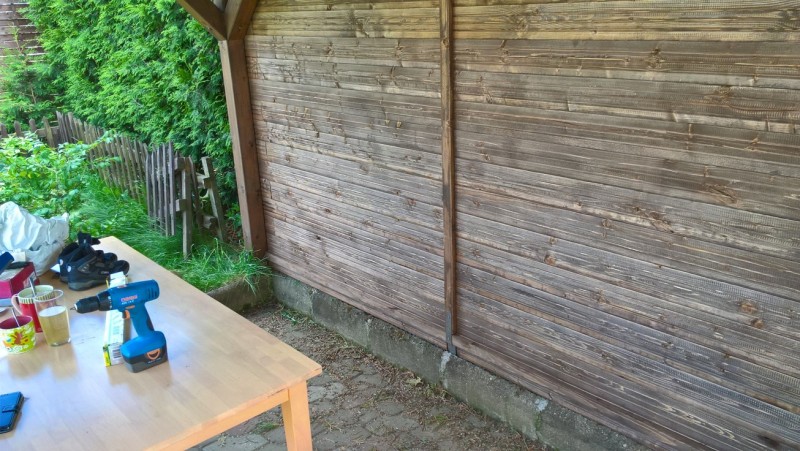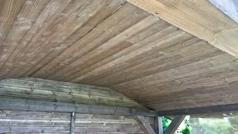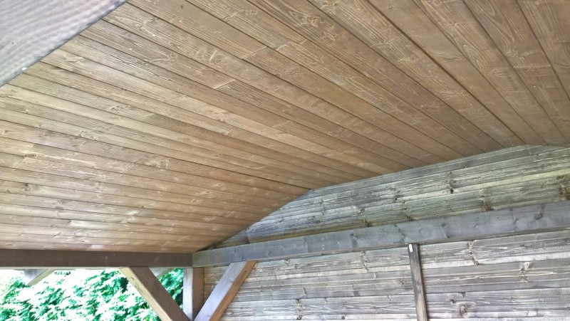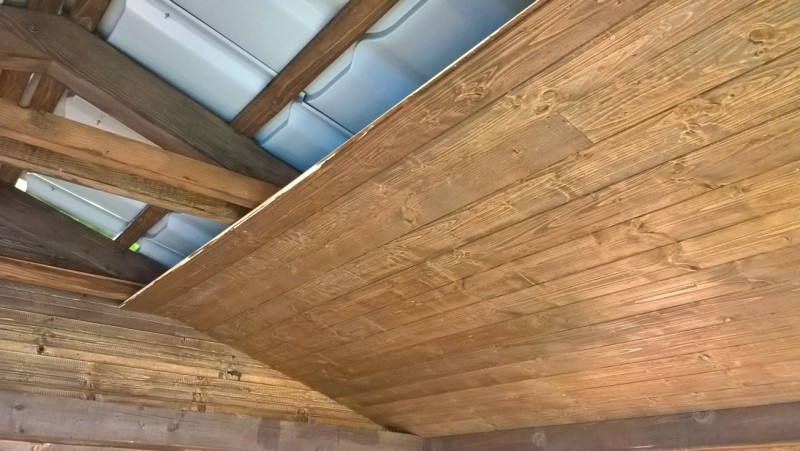 Manželka ale letos na jaře palubkový strop natřela emajlem v odstínu slonová kost (nebo jakém) a boční stěny z palubek také emajlem ale v matné světle zelené barvě (taková spíš světlejší vojenská zelená). Hnědá prý působila depresivně. Přístřešek už využíváme od loňského jara a zatím slouží naprosto spolehlivě.