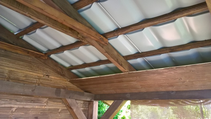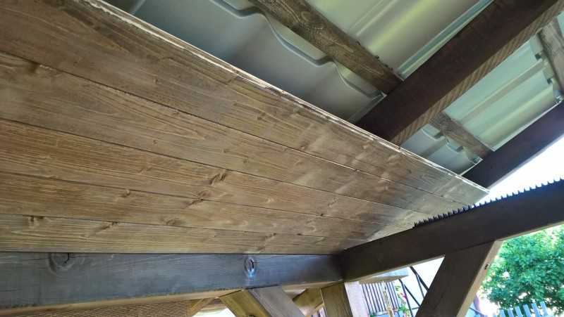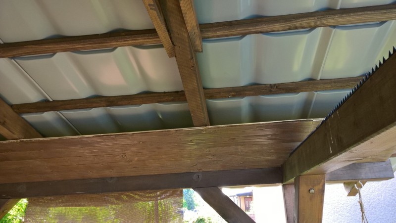 Na krokve jsem nabouchal střešní latě 30*50 mm. Celou konstrukci jsem natřel Luxolem v odstínu ořech. Na latě jsem připevnil plechovou krytinu Satjam, a bylo téměř hotovo.