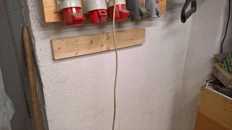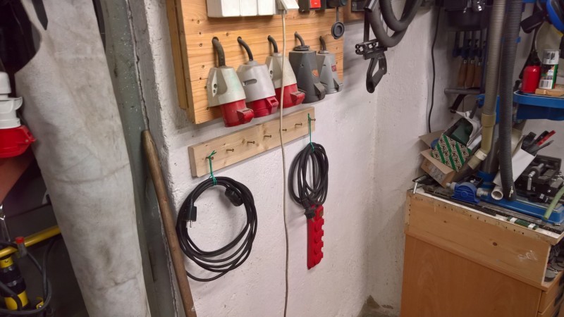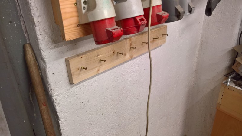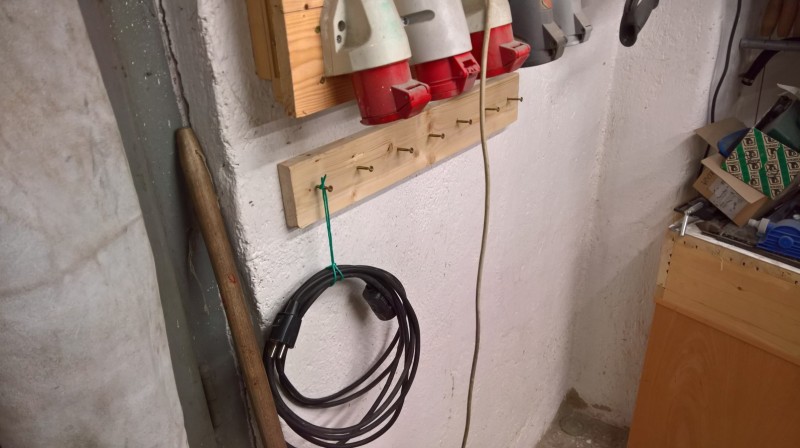 Jelikož jsem si upravil elektrické nářadí a stroje tak, že mají oddělitelné kabely (např. tady, tady nebo tady), musel jsem tyto kabely také někam začít ukládat, aby se mi nepletly. To by pak jejich odstranění od nářadí byla zbytečná práce. Z odpadového materiálu jsem si tedy vyrobil jednoduchý věšáček, kam se všechny smotané kablíky vejdou.