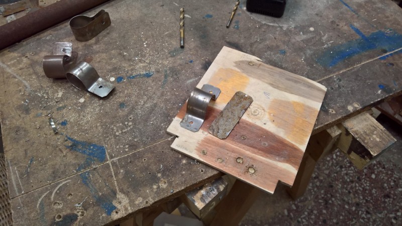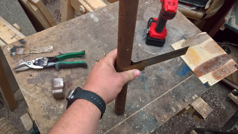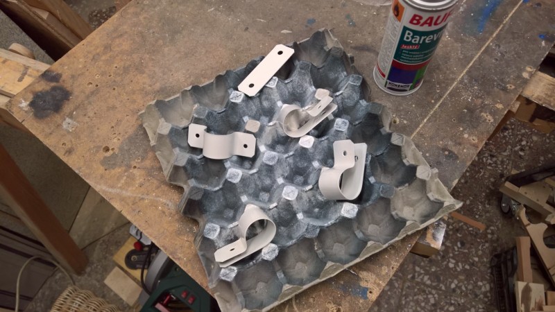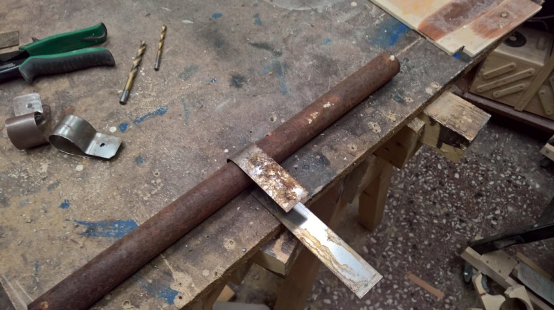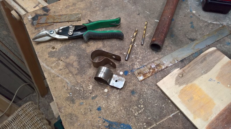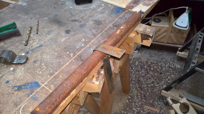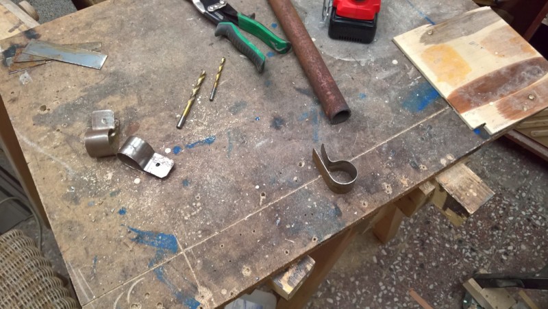 Pak jsem ještě plechového pásu o šířce 3 cm a síle 1 mm vyrobil úchyty plotu. Pás jsem nastříhal na potřebné délky, ohnul podle budoucího sloupku (průměr jsem dal trochu kratší, aby se úchyt šroubem snadno přitáhl) a nakonec také natřel.