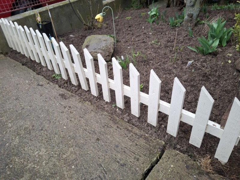 Samotná výroba plotu je nezajímavá. Ze starých smrkových planěk, které byly dlouhé cca 66 cm, jsem nařezal kratší plaňky, konkrétně 30 cm dlouhé, a ty byly přibity na dřevěnou lať o potřebné délce. Celé to ještě žena natřela bílou barvou (její oblíbená, ale brzo se mění na jiné odstíny).