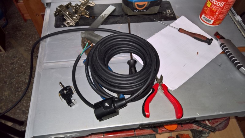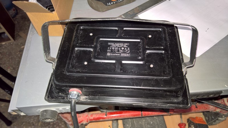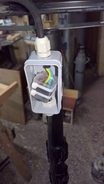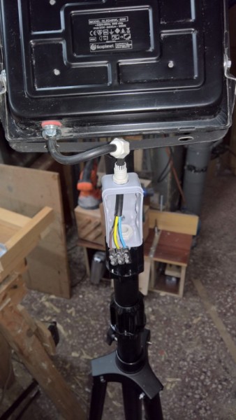 Edit: Šedou krabičku jsem později odmontoval a místo ní na kabel z lampy připevnil zástrčku. A na napájecí prodlužovák klasickou zásuvku. Tím se zjednoduššilo odmontování lampy, když jdu ven s vysílačkou, a zároveň je možné napájecí prodlužovák použít i pro jiná pracovní světla.
