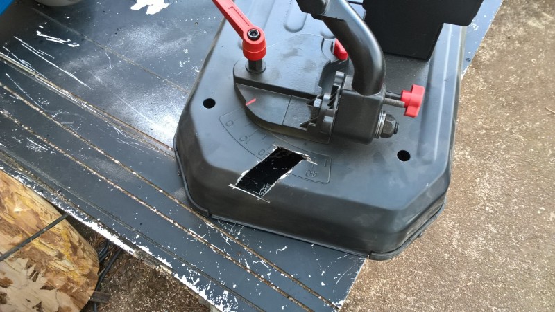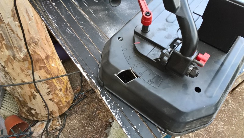 Tento stolek byl naštěstí z lisovaného 1mm plechu, tak nebyl problém kousek vyříznout aby bylo možné pilu vyklopit do krajní polohy.