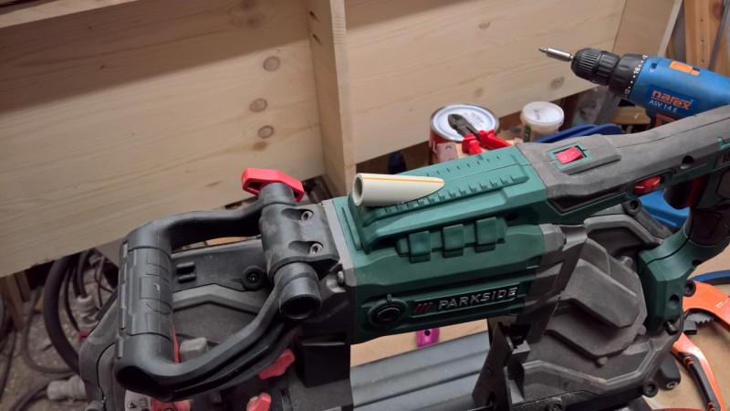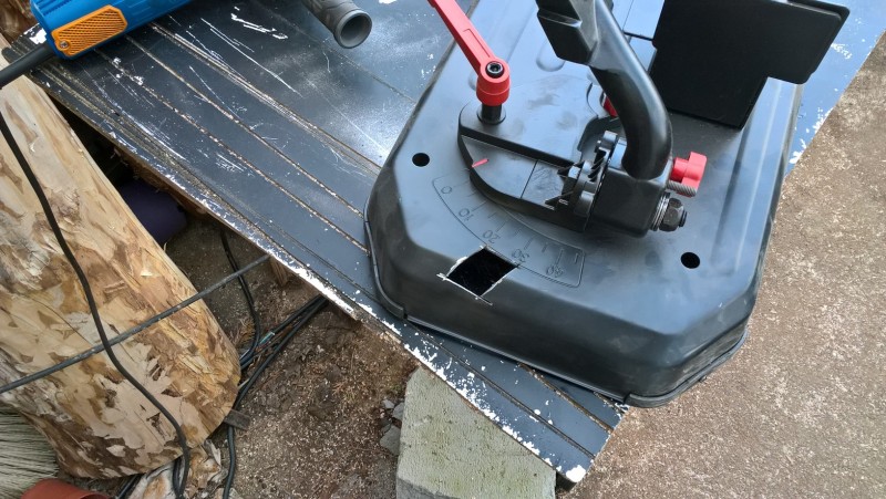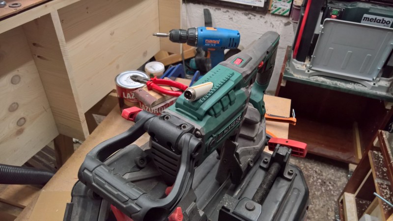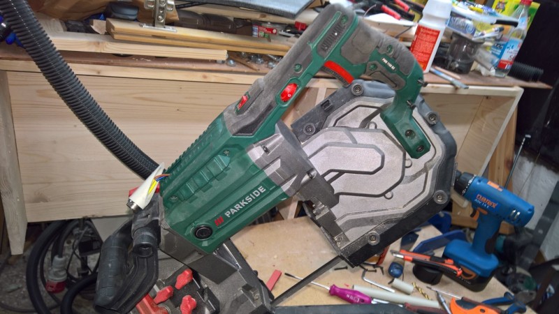 Úpravy jsem provedl celkem 3. První úprava byla vyříznutí rámu pily, aby bylo možné pilu zvednout do pohotovostní polohy. Další úprava byla vyrobení zajišťovacího kolíku pro tuto polohu. A třetí úprava byla nahrazení pevného napájecího kabelu vyměnitelným (jako jsem to už dělal u jiného elektrického nářadí).