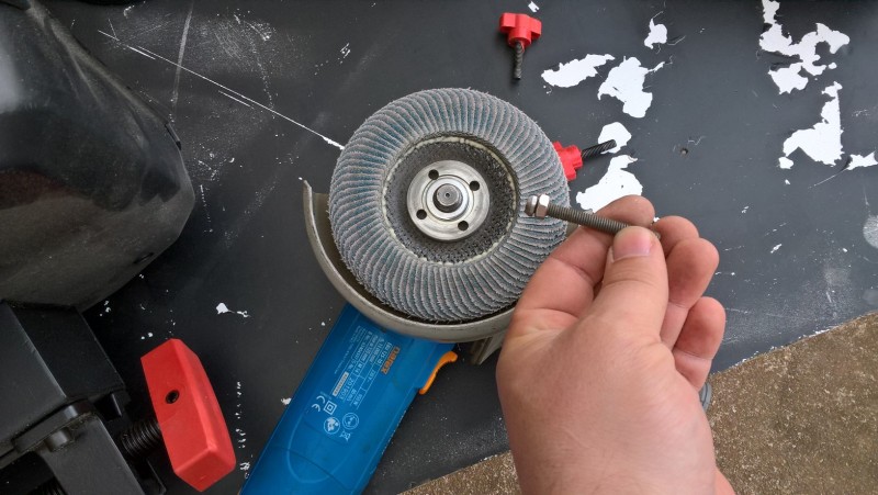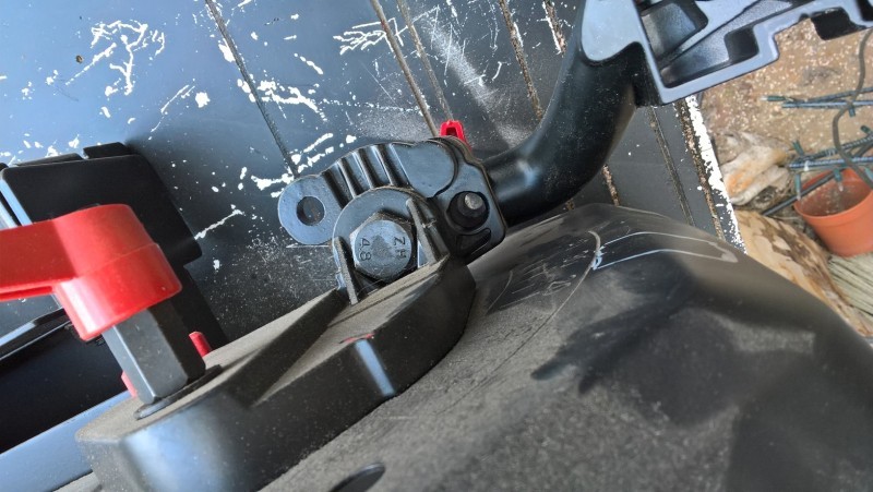 Jako zajišťovací kolík jsem použil šroub M6, jehož hlavu jsem obrousil dokulata (ve stojanu byl pro to připravený důlek). Takto upravený šroub jsem provlékl stojanem do (z výroby!) připraveného otvoru, kde bylo i místo na pružinku, přitlačující kolík do zajišťovacího důlku. Tu jsem tam samozřejmě taky přidal. Pak jsem to celé sešrouboval a bylo hotovo.
