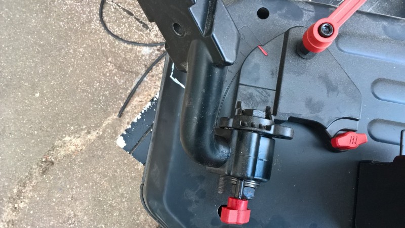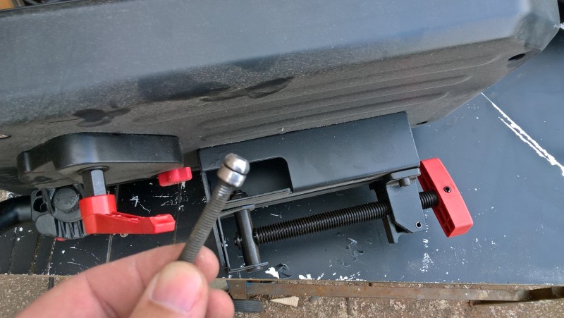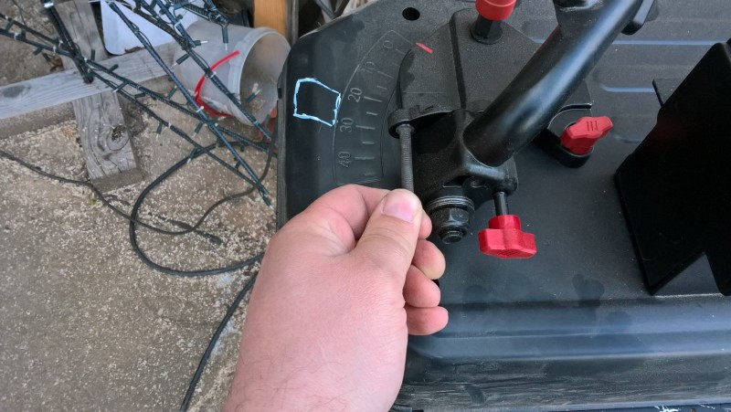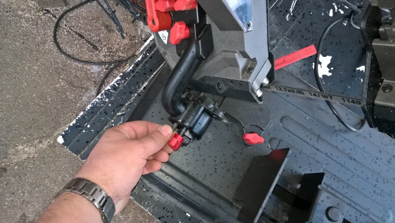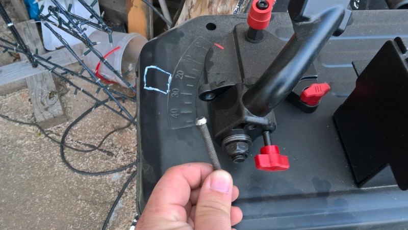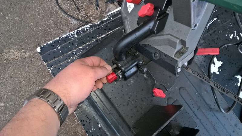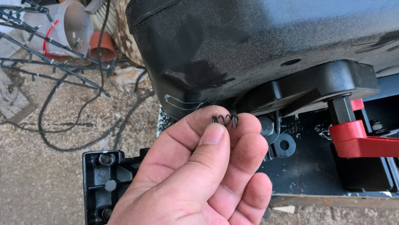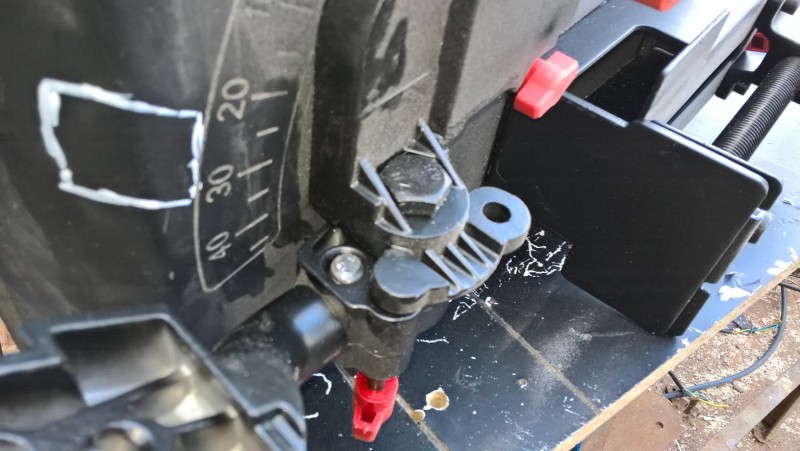 Když pilu zvednu, šroub/kolík zapadne díky pružině do důlku a pila zůstane zajištěna v horní poloze. Když chci řezat, zatáhnu za šroub (přidal jsem mu plastovou kuličku, aby se lépe držel), čímž se zajištění uvolní a já můžu pilu spustit a začít řezat.