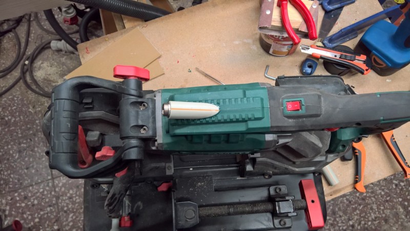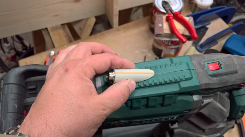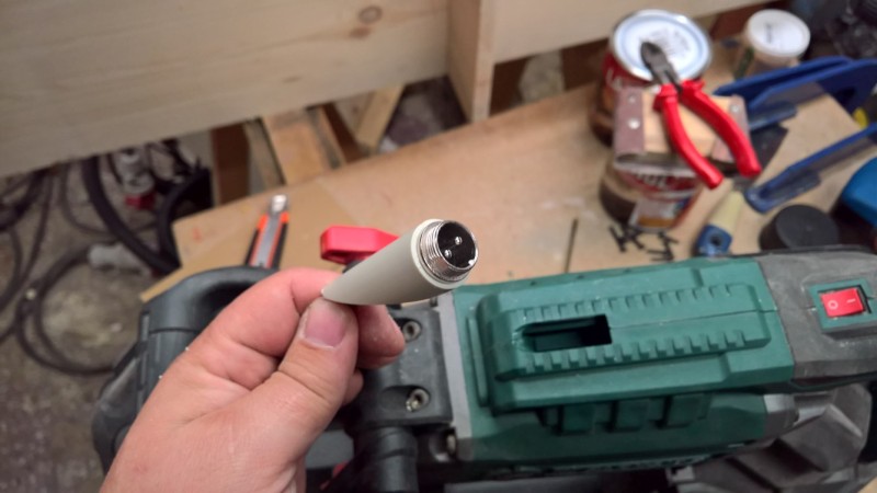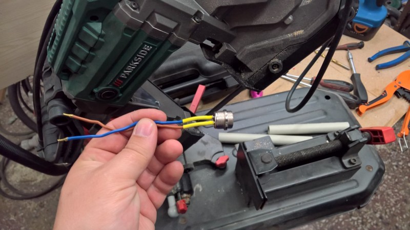 Jako už u jiných ručních strojů, jsem i tady vyměnil pevný PVC napájecí kabel za konektor, do kterého jde připojit vyměnitelný sdílený napájecí kabel.