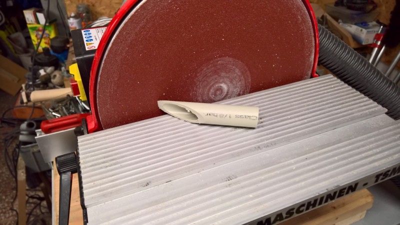 Jediné co bylo nutné udělat jinak, byl šikmý nástavec pro konektor, protože průchodka kabelu byla také šikmá. Nástavec jsem udělal z vodovodní trubky o průměru 20 mm, kterou jsem na jedné straně šikmo seřízl a přilepil epoxidem k pile. Na druhou stranu jsem připevnil konektor a celé to propojil a připevnil.