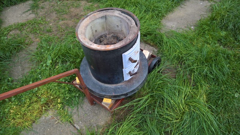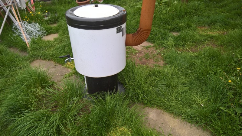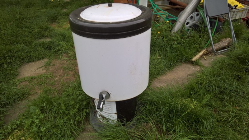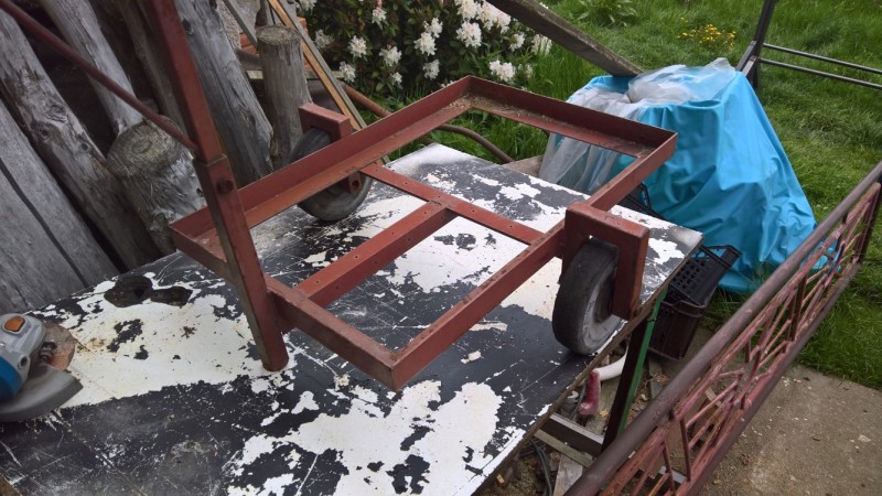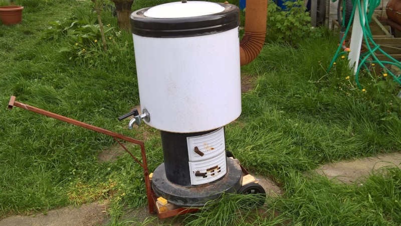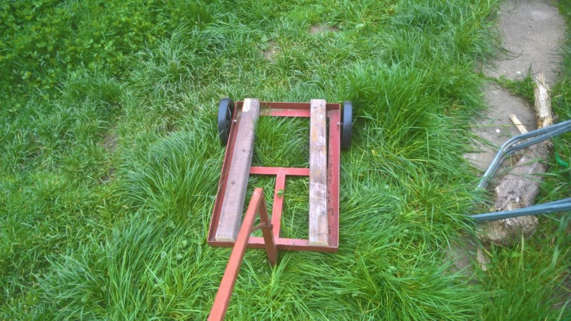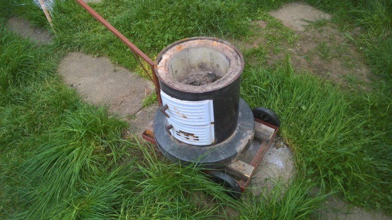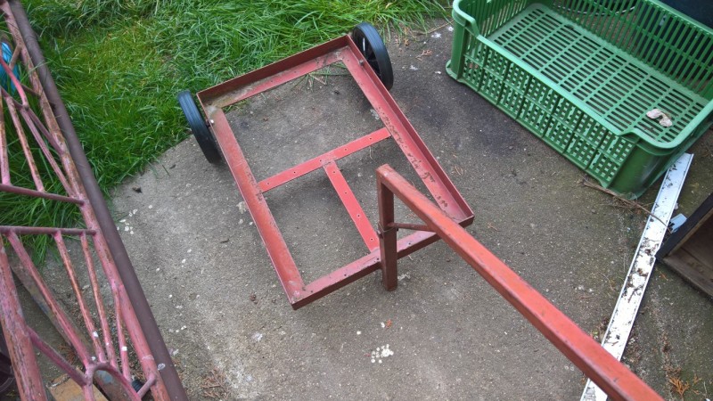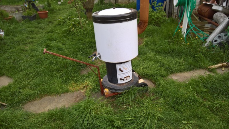 S domem jsme koupili teplovodní kotel Butar. Ten jsme nevyhodili, ale naopak ho používáme při zavařování kompotů nebo pro rychlé a levné ohřátí většího množství vody, k čemuž je naprosto ideální. Nicméně kotel používáme na zahradě (místo komínu má jen rouru, což je dostačující) a musím ho vždy dostat z/do kůlny, kde je uskladněný. Ze starého materiálu jsem vyrobil vozík, na kterém kotel mohu snadno převážet.