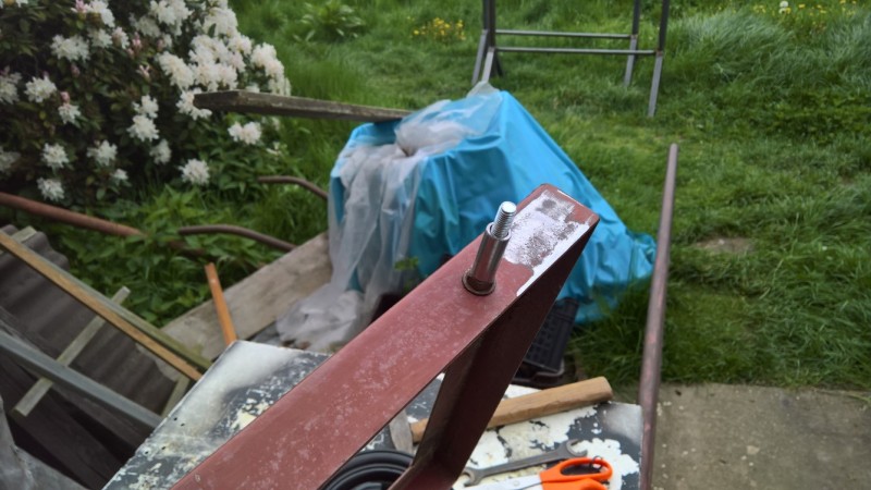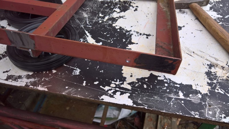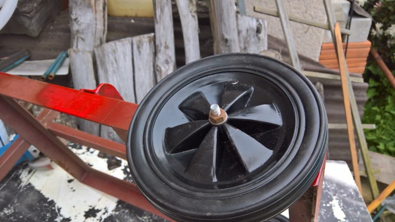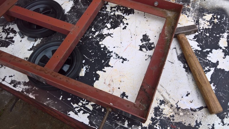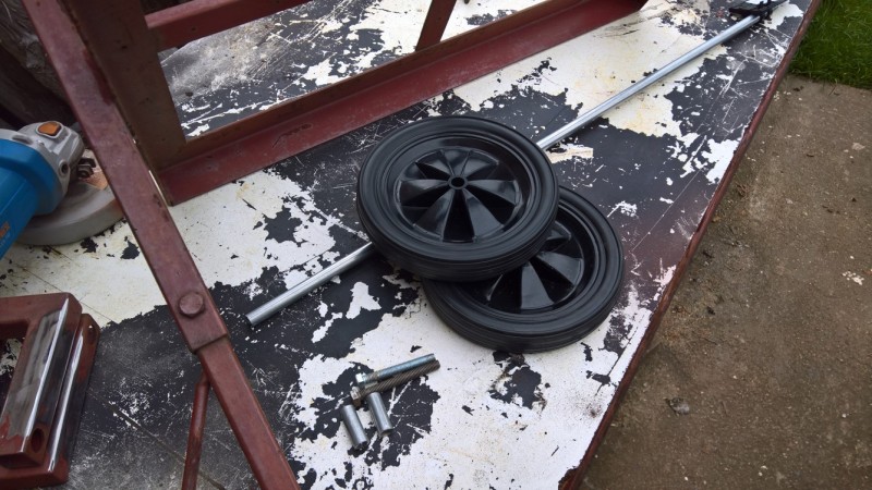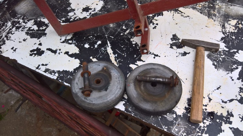 Z vozíku jsem odřízl původní kolečka, která byla uprostřed (a překážela by kotli). Pak jsem v zadní části podvozku vyvrtal otvory o průměru 8mm, tam jsem připevnil šrouby M8, které budou sloužit jako upevnění nových koleček. Na ně jsem navlékl ocelové trubičky, na které se navlékly kola a utáhl maticí. Přesahující šroub jsem potom zařízl.