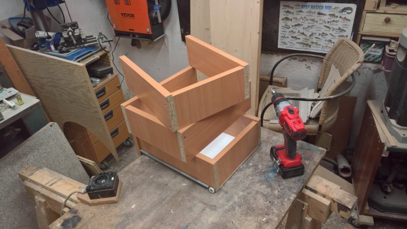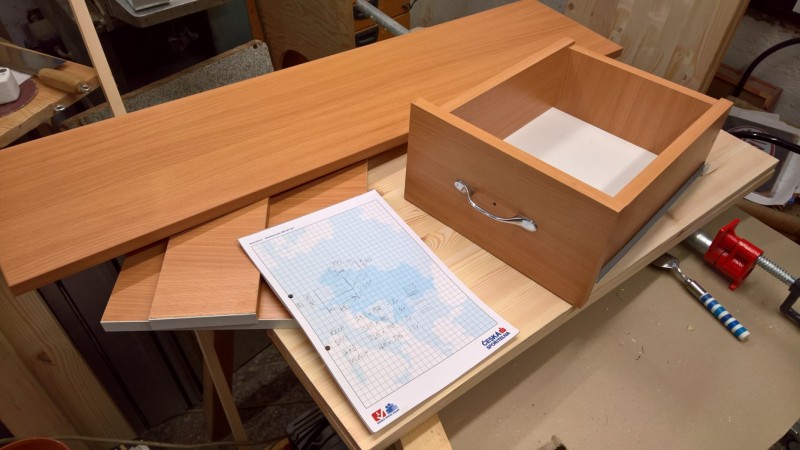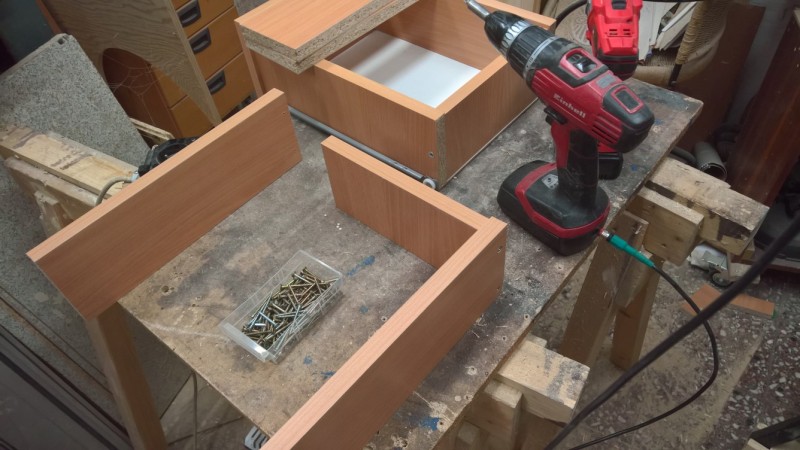 Jeden z mých čtenářů mě začátkem léta požádal, jestli bych mu nevyrobil dvě zásuvky k psacímu stolu, který má doma. Zásuvky jsou z lamina, dekor dub. Pán mi jednu přivezl jako vzor a tak jsem se do toho pustil.