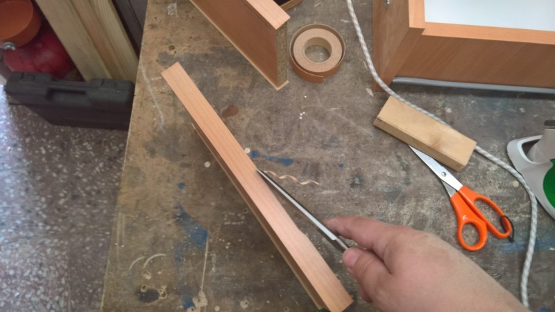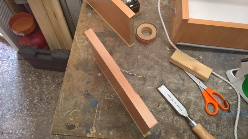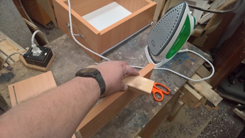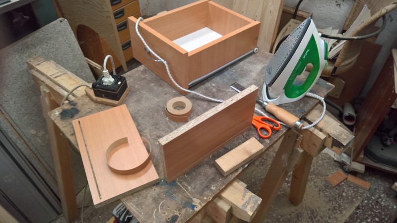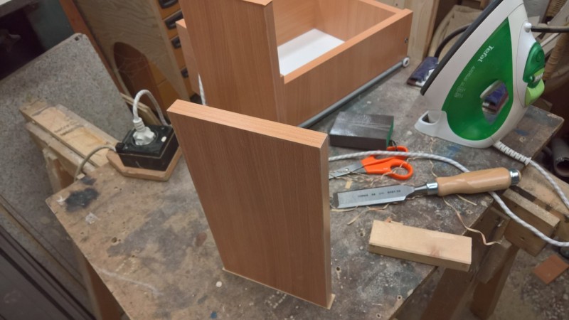 Pak jsem všechny části olepil nažehlovací hranou. Přední čelo ze všech stran a boční stěny zásuvek pouze z pohledové horní strany (jako u originálu). Pak jsem boční strany sešrouboval a podbil sololakem. Do přední strany jsem vyfrézoval drážku pro sololak a desku pak ke zbytku šuplíku přilepil na kolíky. A bylo hotovo.